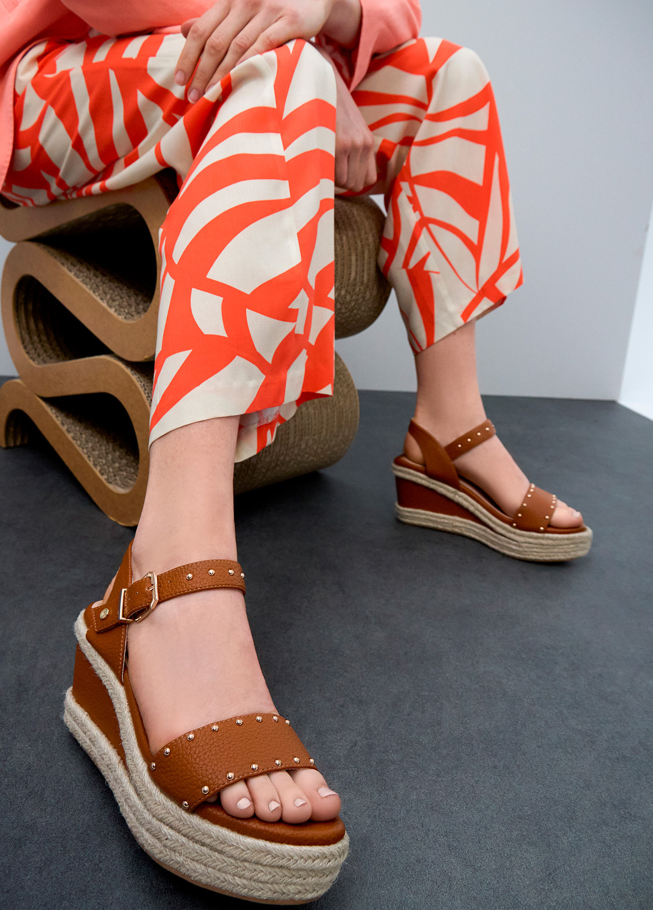 Keilsandalen mit Rafia-Effekt-Sohle und Metallelementen