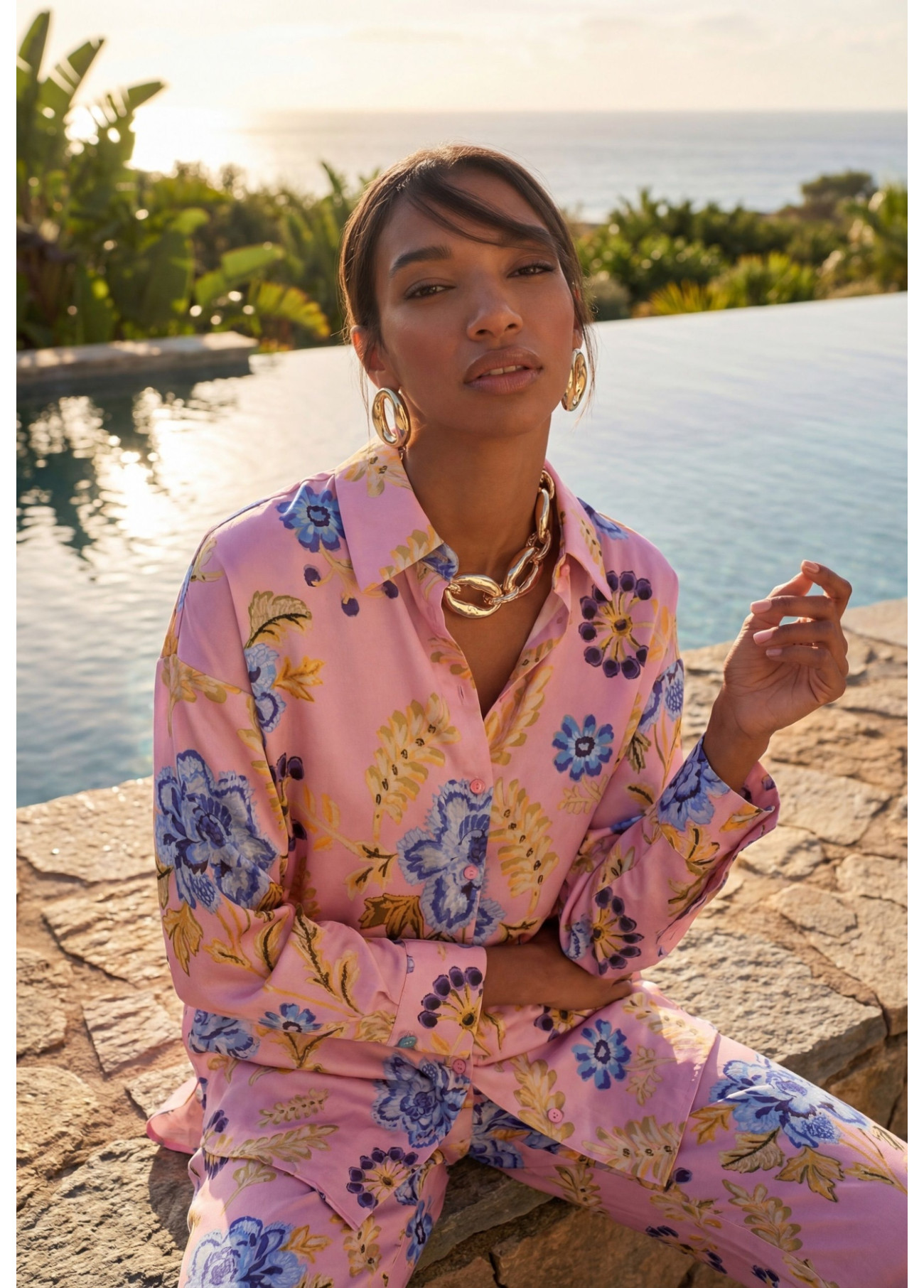 Übergroßes Hemd aus glattem Satin mit lebhaftem Blumenmuster. Weich im Griff, bietet es einen eleganten Fall und eine entspannte Passform. Lange Ärmel mit verstellbaren Manschetten und klassischem Kragen. Perfekt, um jedem Outfit einen Farbtupfer zu verleihen.