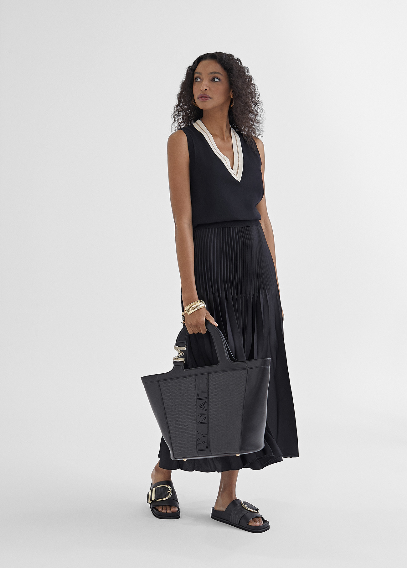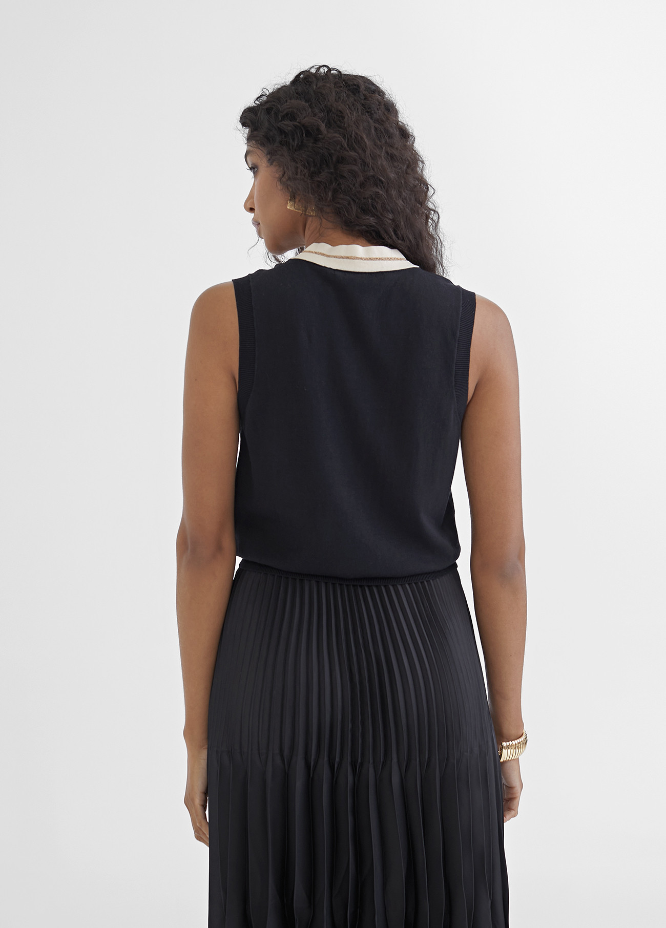 Strickweste. V-Ausschnitt mit Rippstrick-Stickereien. In der Taille gerafft.
