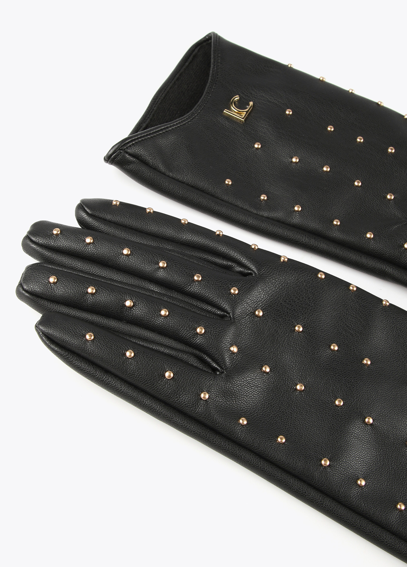 Handschuhe aus Kunstleder mit Nieten. Mit goldenen Logo-Schriftzügen für einen schicken Touch. Raffinierte und moderne Verarbeitung.