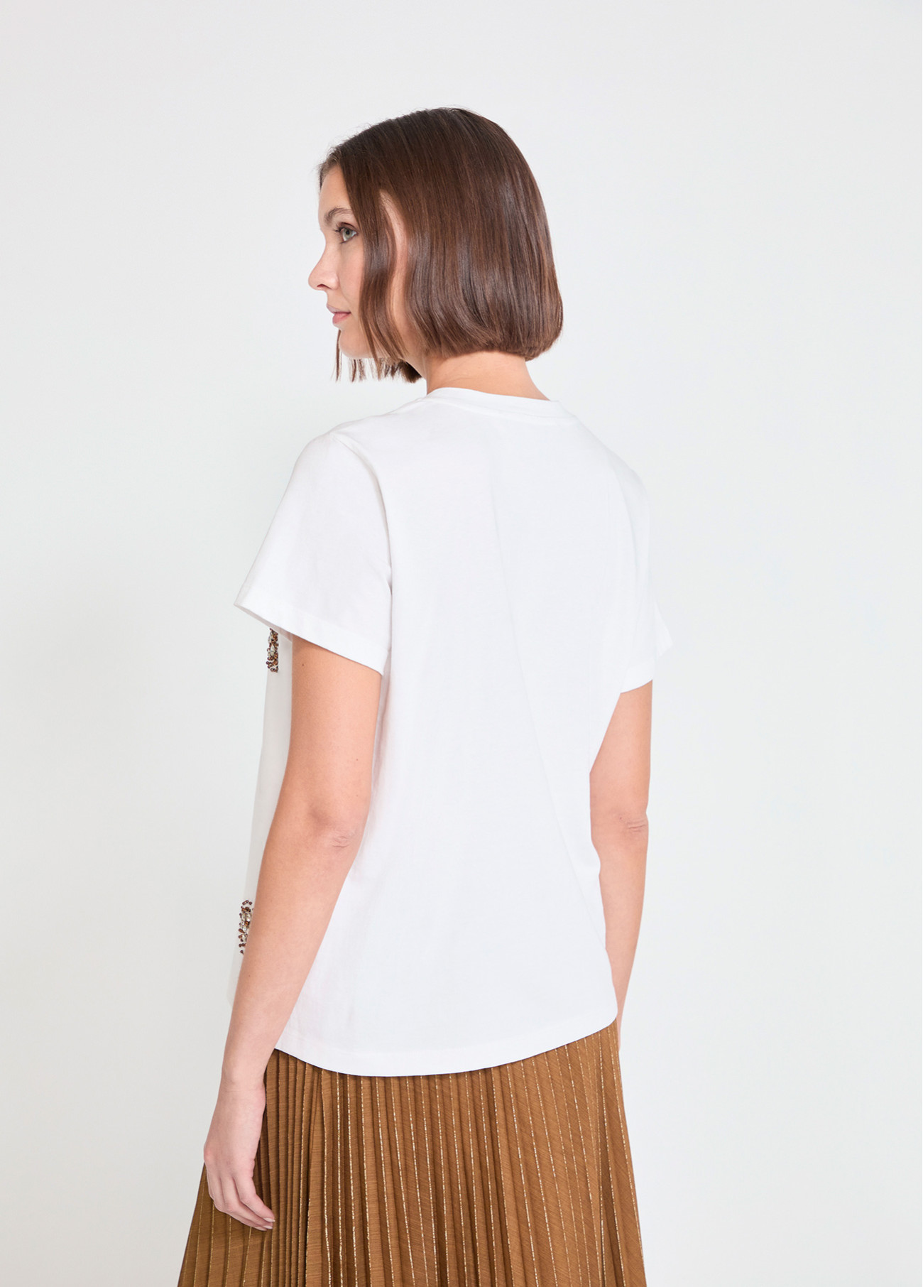 Weißes Baumwoll-T-Shirt mit funkelnden Blumenjuwelen verziert. Rundhalsausschnitt und kurze Ärmel für einen eleganten Touch. Perfekt, um mit Basics zu kombinieren oder Casual-Looks aufzuwerten.