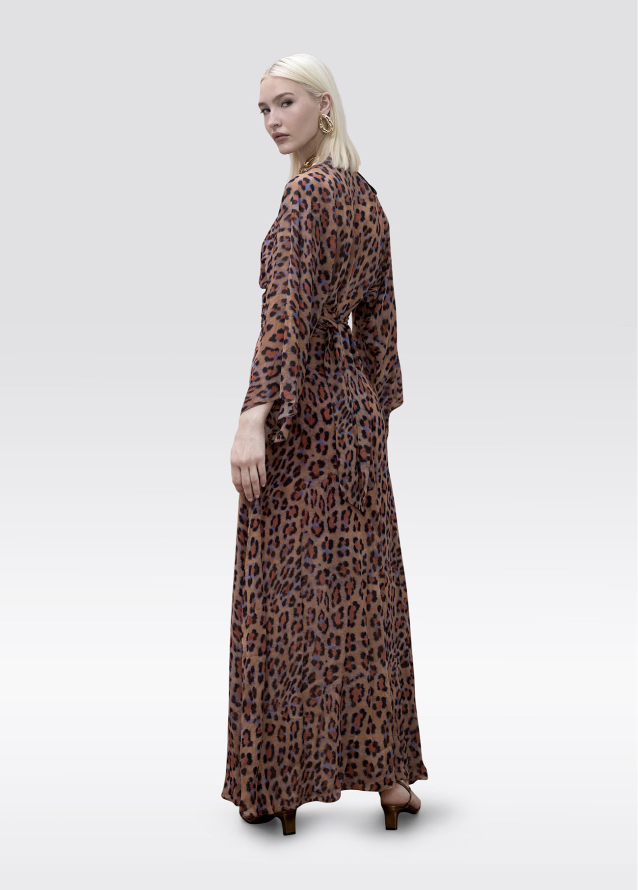 Langes Kleid mit Tierdruck und weiten Ärmeln, ideal um aufzufallen. Anpassbare Passform mit einstellbarem Gürtel. Leichter und fließender Stoff bietet Bewegung und Eleganz. Geeignet für Tages- oder Nachtveranstaltungen.