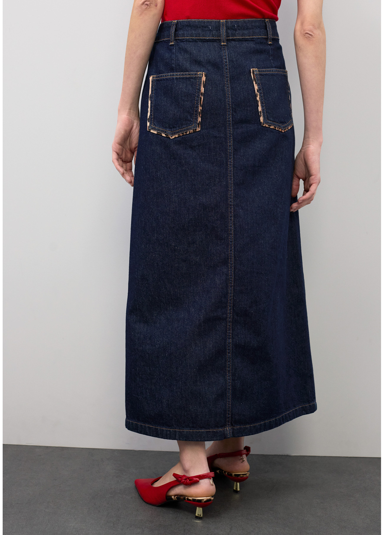 Langer Jeansrock mit Leopardenbesatz Details an den Taschen