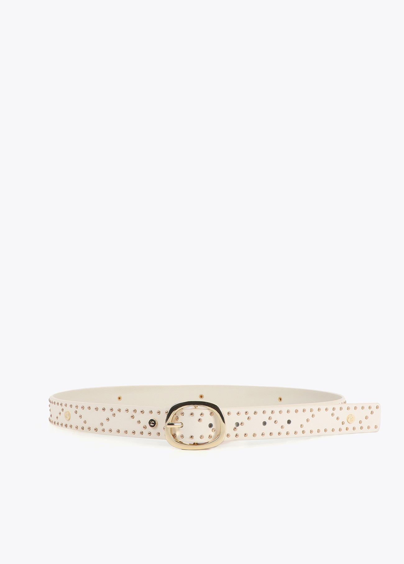 Eleganter Gürtel in Cremefarbe, verziert mit logo-geprägten Nieten und metallischen Anwendungen. Ovale Goldschnalle für perfekten Halt. Ideal, um jedem Outfit einen schicken Touch zu verleihen.