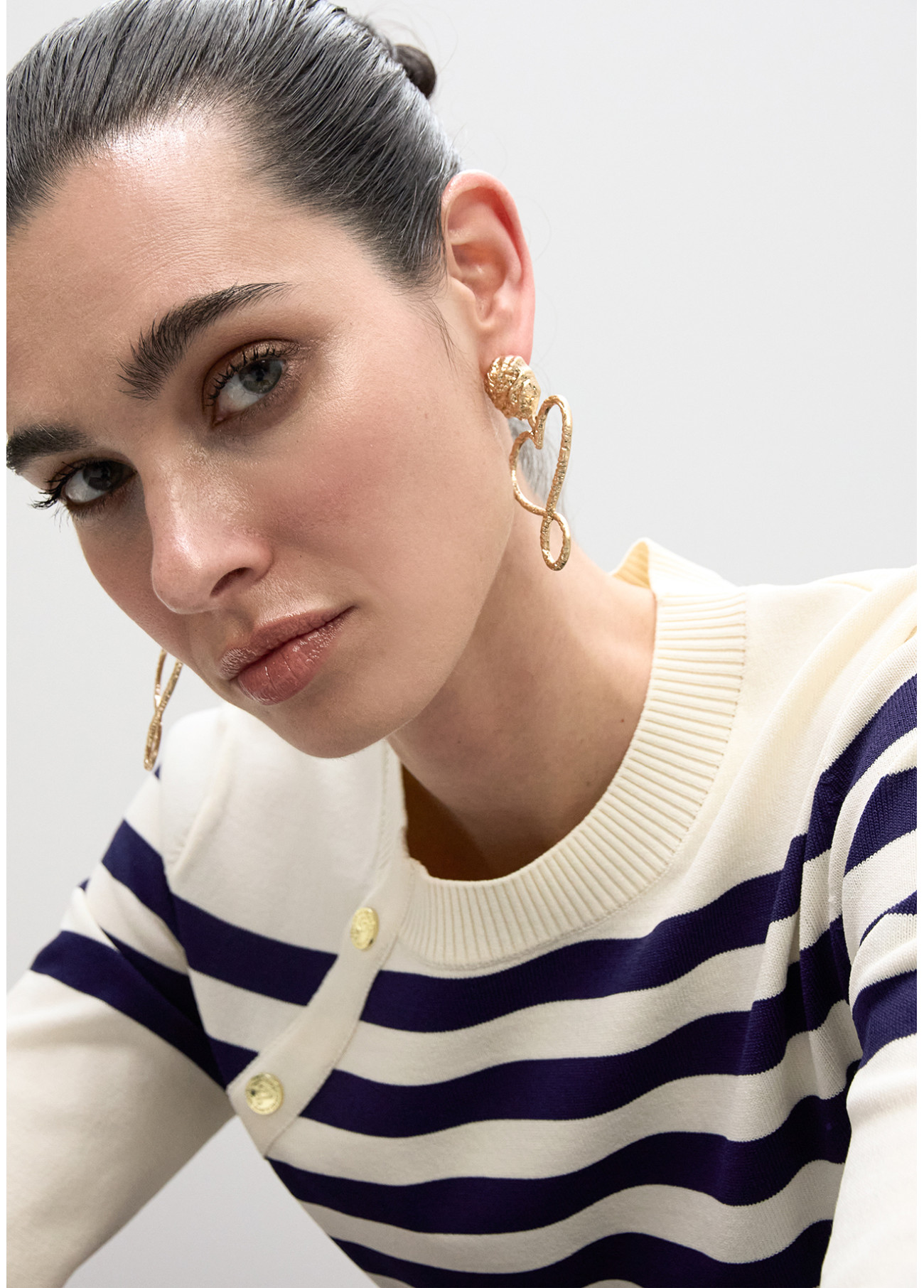 Goldene Ohrringe in Herzform mit Unendlichkeit Design und gehämmerter Textur. Hochwertiges Metall mit Stecker-Verschluss und graviertem Logo. Verleiht Alltag-Outfits oder besonderen Anlässen Raffinesse.