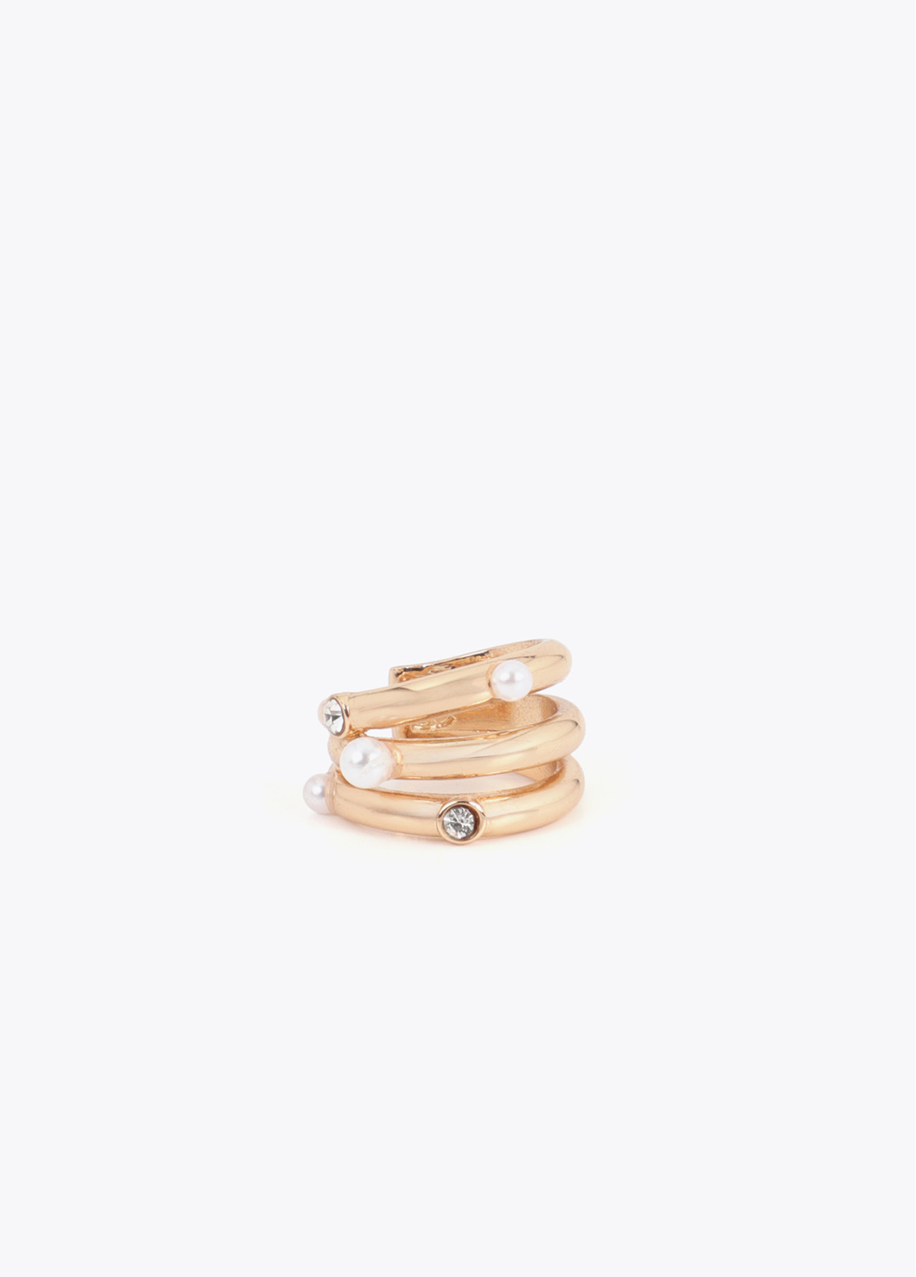 Eleganter Ohr-Cuff in Goldoptik, verziert mit zarten Perlen und funkelnden Kristallen. Offenes, verstellbares Design, das sich perfekt am Ohr anpasst. Die goldene Ausführung verleiht jedem Outfit einen Hauch von Raffinesse. Ideal für besondere Anlässe und Abendlooks.