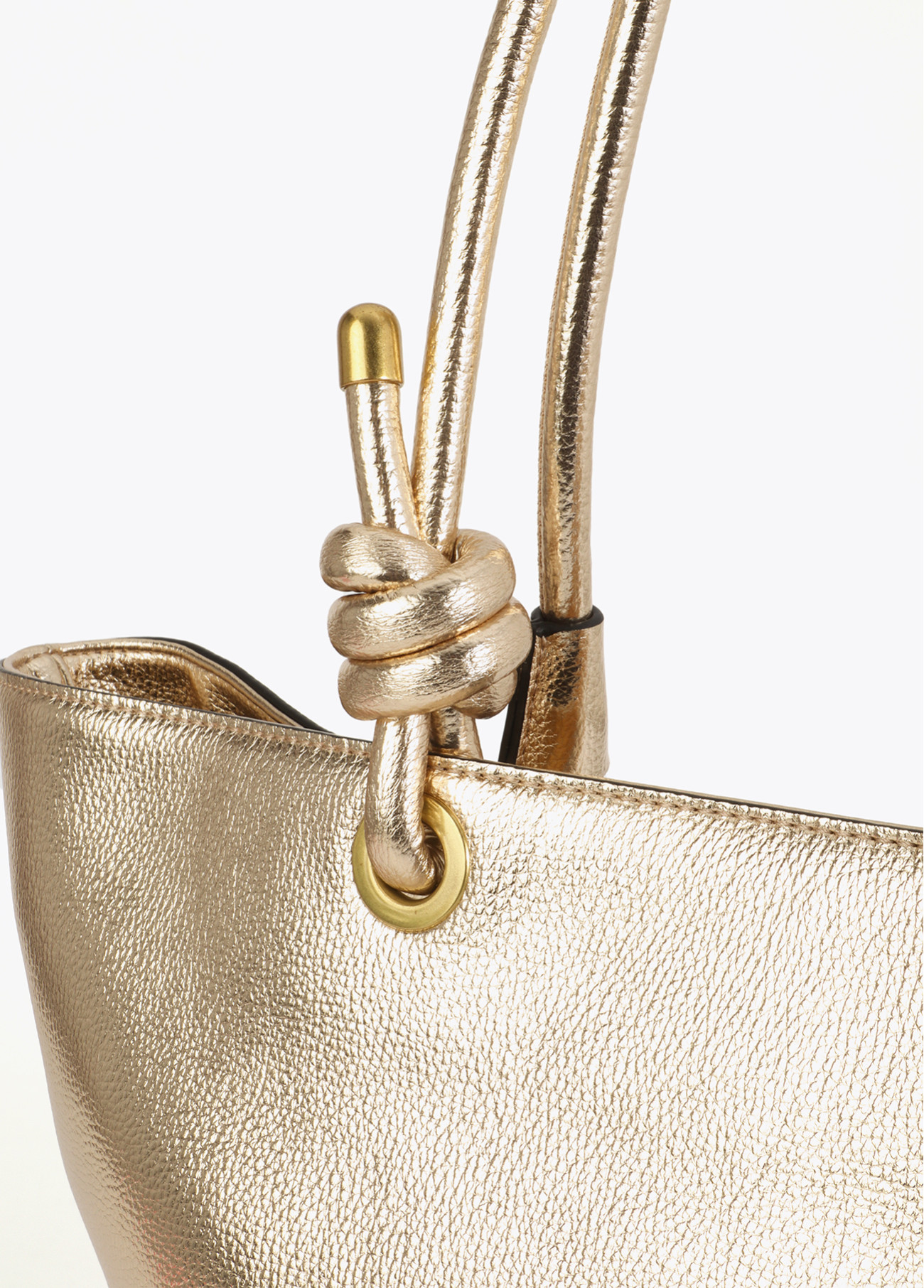 Destrukturierte Shopper in glänzender Goldoptik mit geprägtem ovalem Logo. Doppelt verflochtene Griffe und oberer Reißverschluss. Geräumiges Inneres mit Seitentasche zur Organisation. Perfekt, um jedem Outfit einen glamourösen Touch zu verleihen.