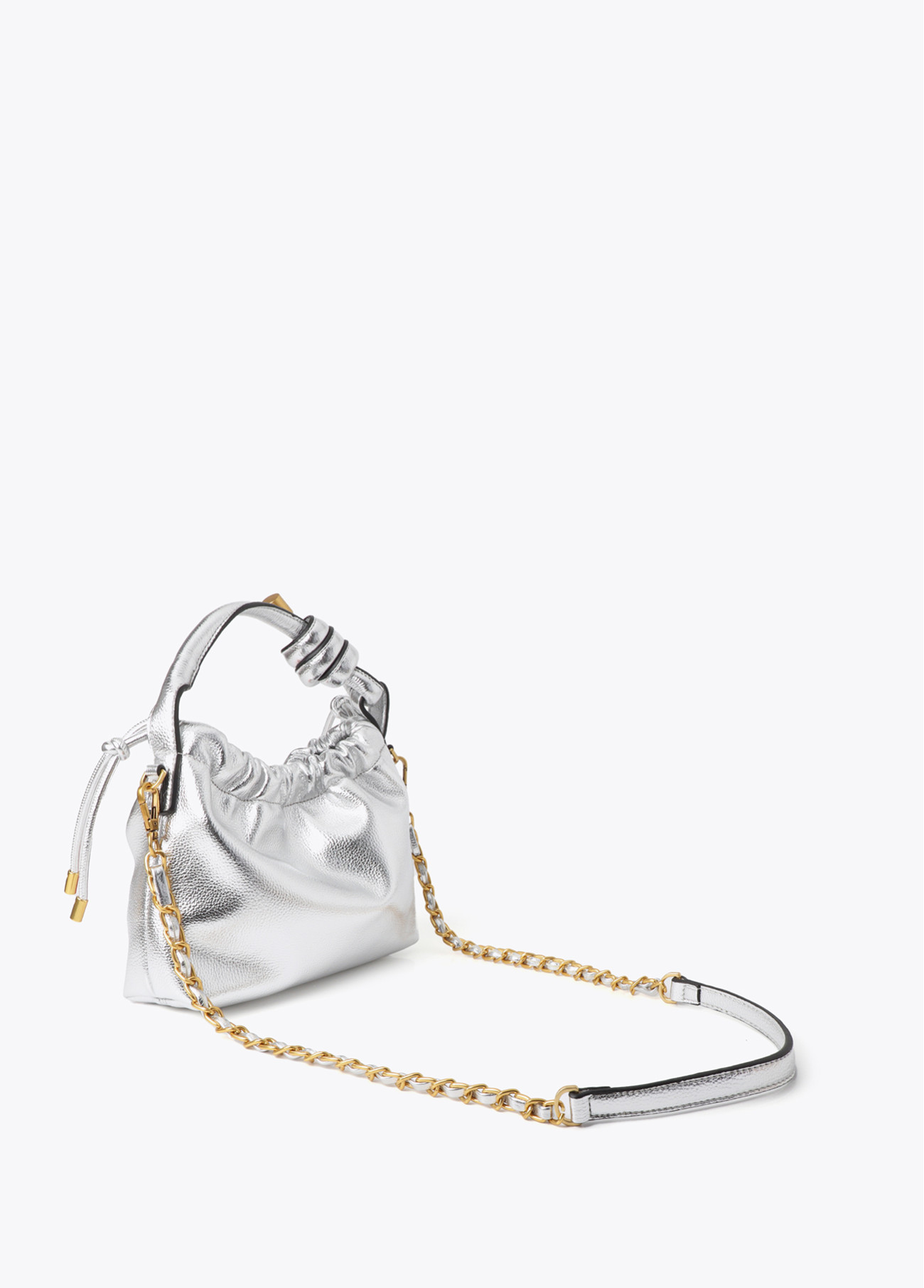 Goldene metallische Beuteltasche mit ovalem geprägtem Logo. Kordelzugverschluss und goldener Kettenriemen. Gefüttertes Inneres mit viel Platz. Perfekt, um jedem Look einen modernen und eleganten Touch zu verleihen.