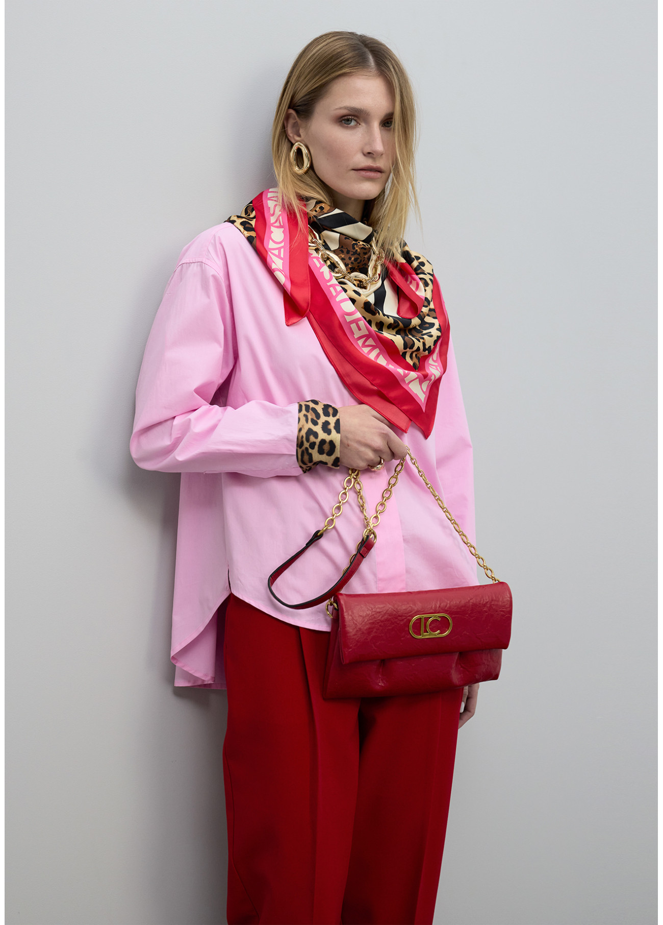 Chic Umhängetasche in leuchtendem Rot mit eleganter Faltklappe. Abnehmbare Goldkette für vielseitigen Stil. Goldenes Frontlogo und sicherer Magnetverschluss.