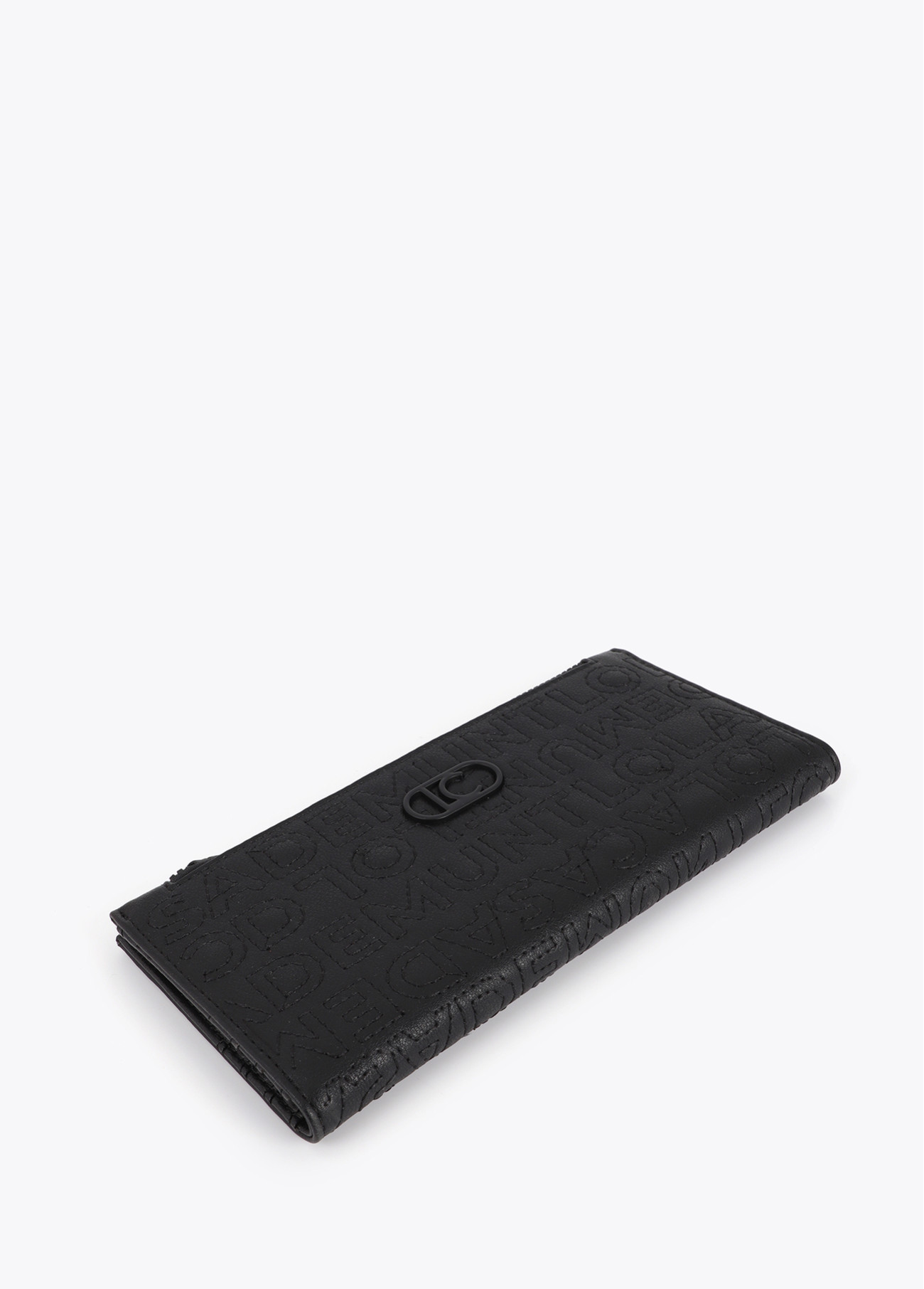 Elegantes Portemonnaie aus synthetischem Material mit Stickerei, die das Logo bildet. Interne Kartenfächer und Reißverschluss. Ein anspruchsvolles Accessoire mit schwarzem Finish, ideal für diejenigen, die Funktionalität und Eleganz suchen.