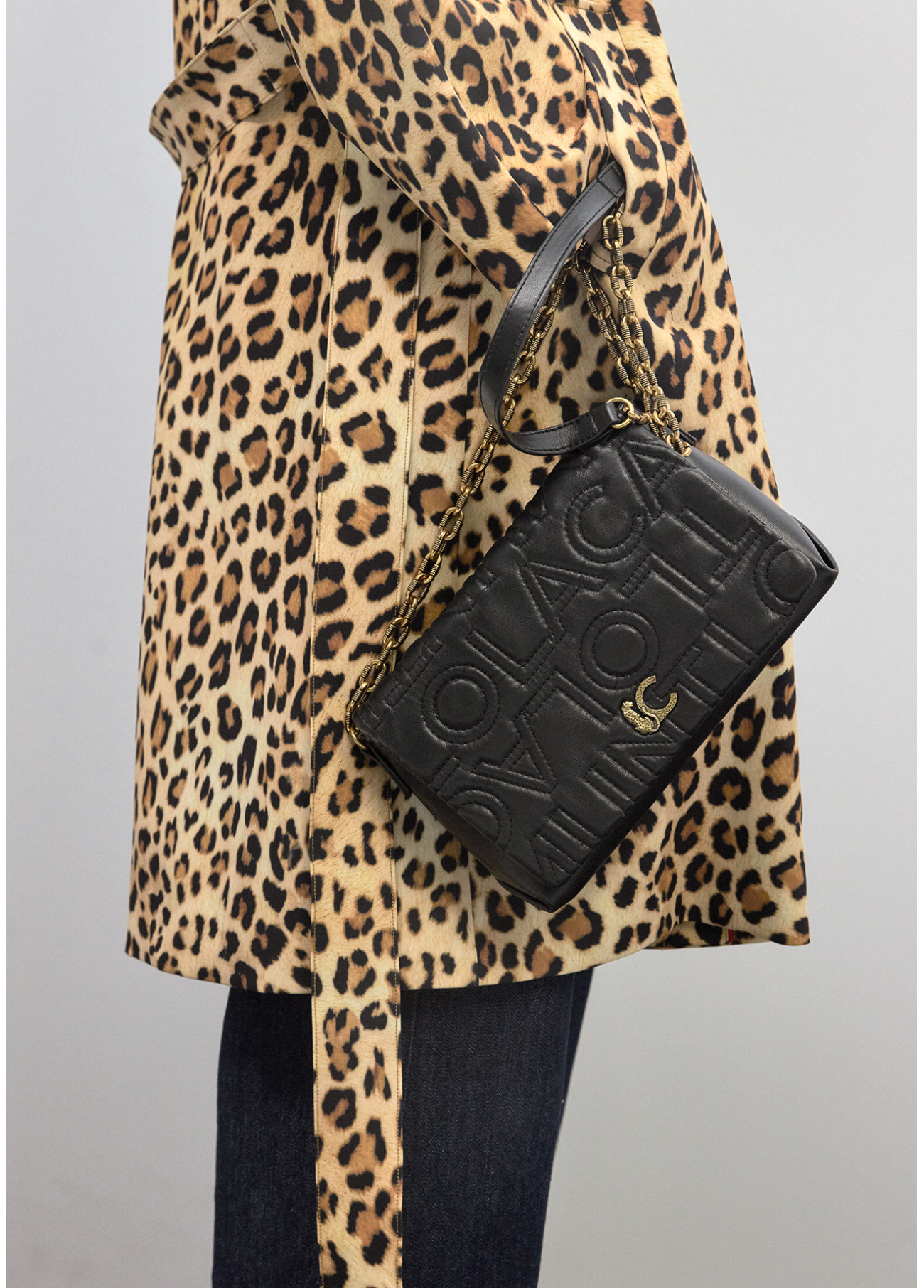 Elegante Umhängetasche mit texturierter Klappe und auffälligem gestepptem Logo. Kompaktes Design mit verstellbarer goldener Kette und sicherem Magnetverschluss. Perfekt für einen raffinierten Look.
