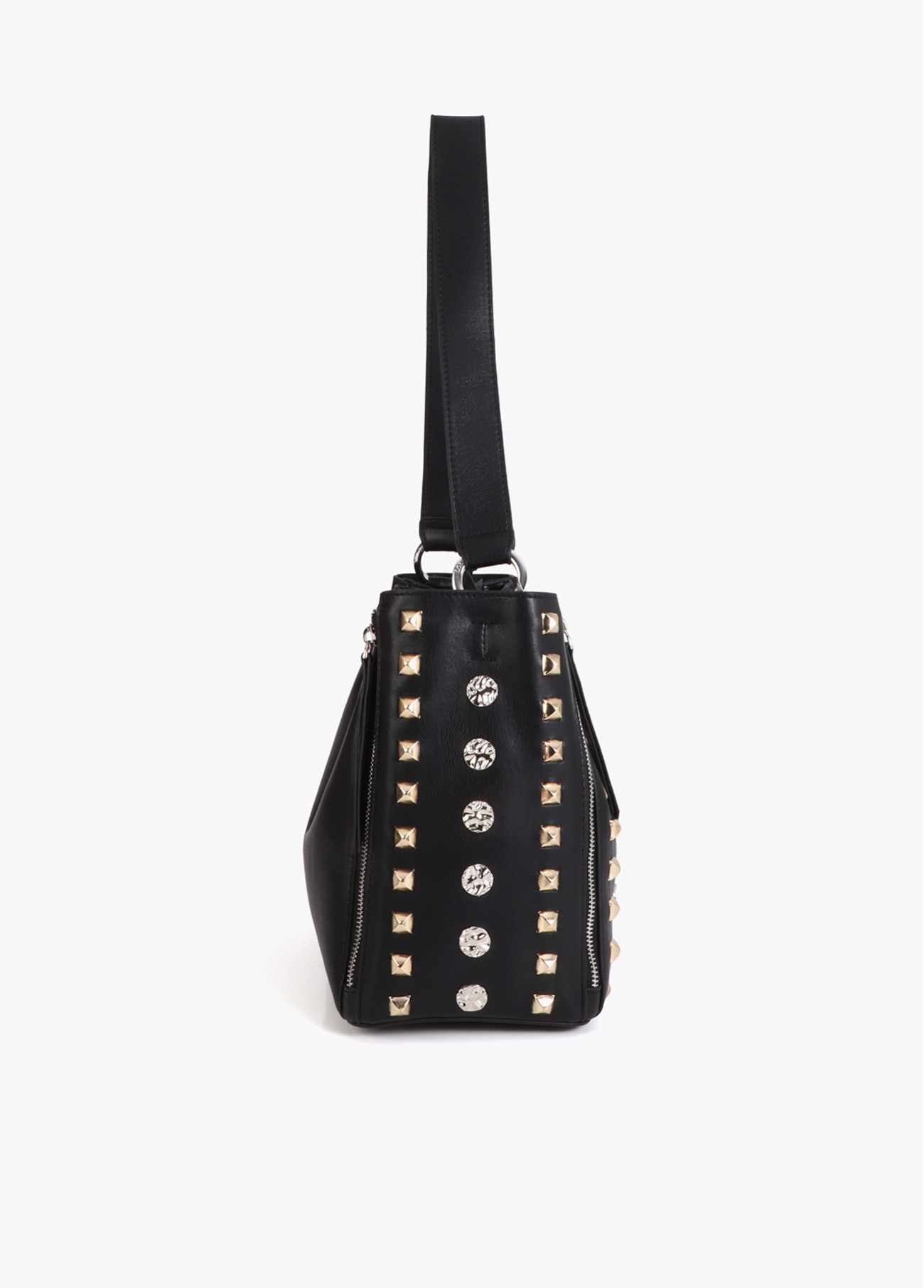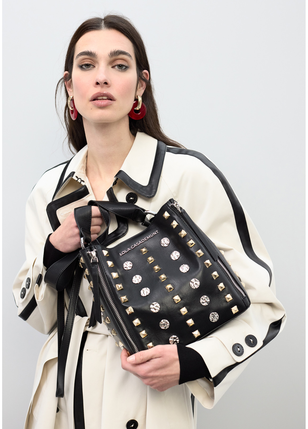 Diese elegante Schultertasche bietet ein kühnes Design mit goldenen und silbernen Nieten. Gefertigt aus hochwertigem Kunstleder, perfekt um Ihrem urbanen Look einen rockigen Chic zu verleihen. Beinhaltet Reißverschluss und verstellbaren Riemen für zusätzlichen Komfort.