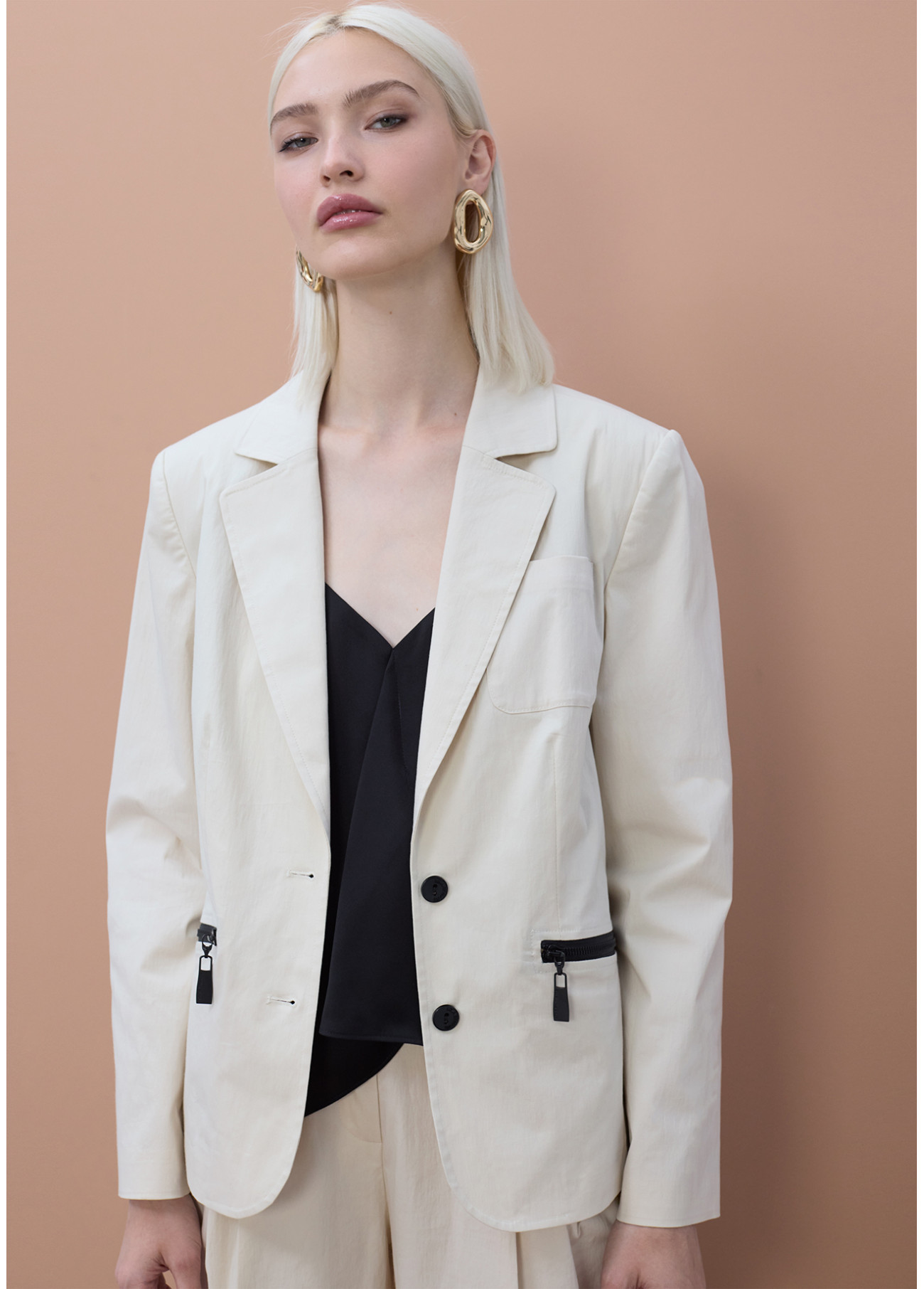 Eleganter taillierter Blazer mit lackierten Reißverschlusstaschen. Modernes Design in leichtem Stoff, das Komfort und Stil bietet. Perfekt für einen professionellen oder lässig-schicken Look, mit Knopfverschluss und präzisen Nähten für eine perfekte Passform. Ideal für jeden Anlass.