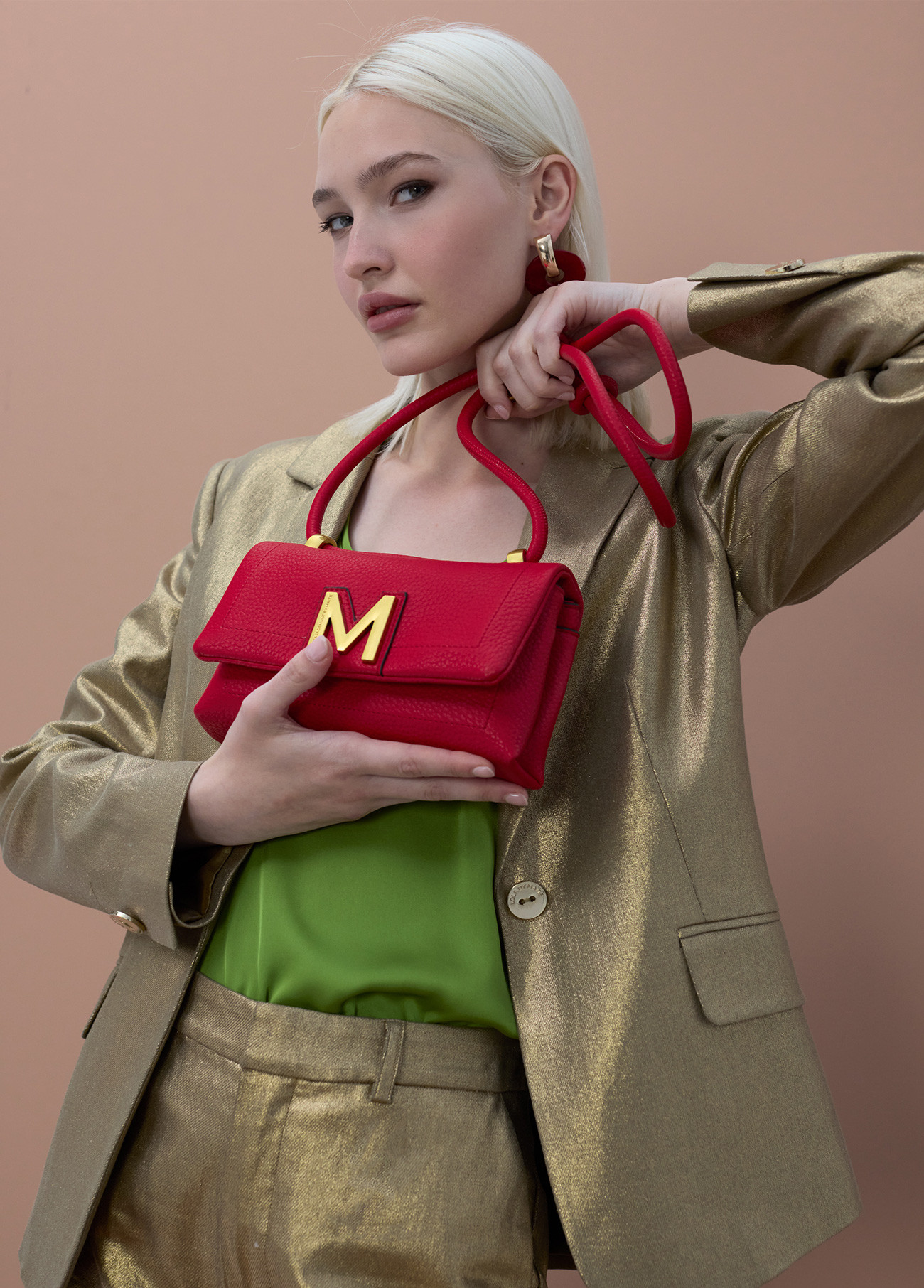 Elegante rote Umhängetasche aus synthetischem Material mit texturierter Oberfläche. Mit Klappe und Magnetverschluss sowie goldfarbenem 'M'-Logo. Verstellbarer Gurt für Komfort und Vielseitigkeit.