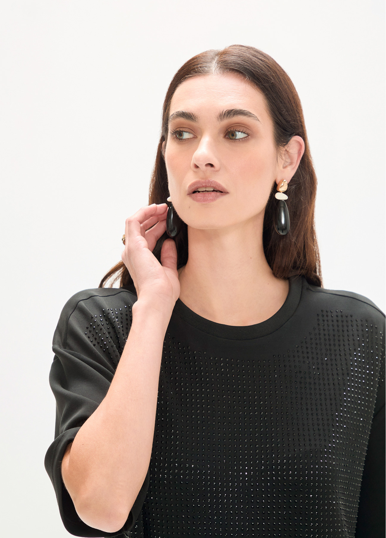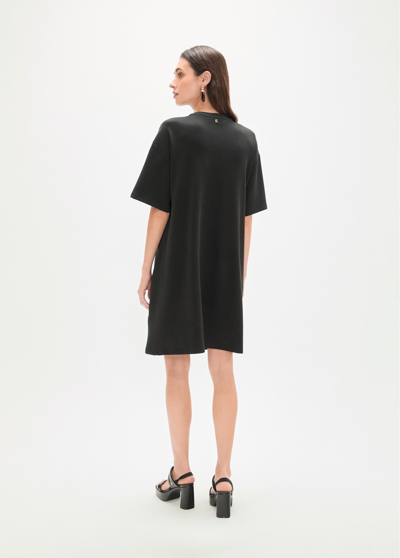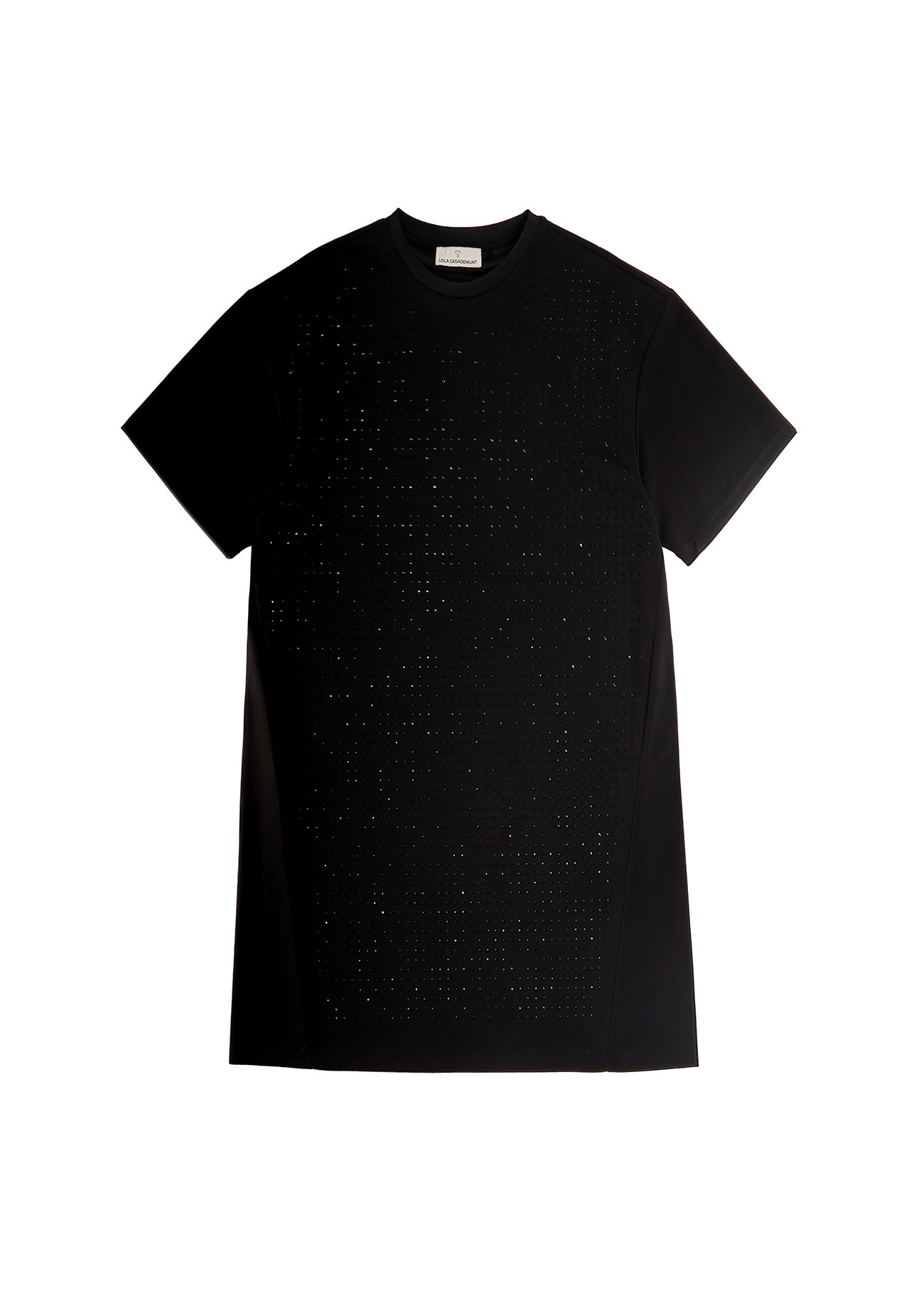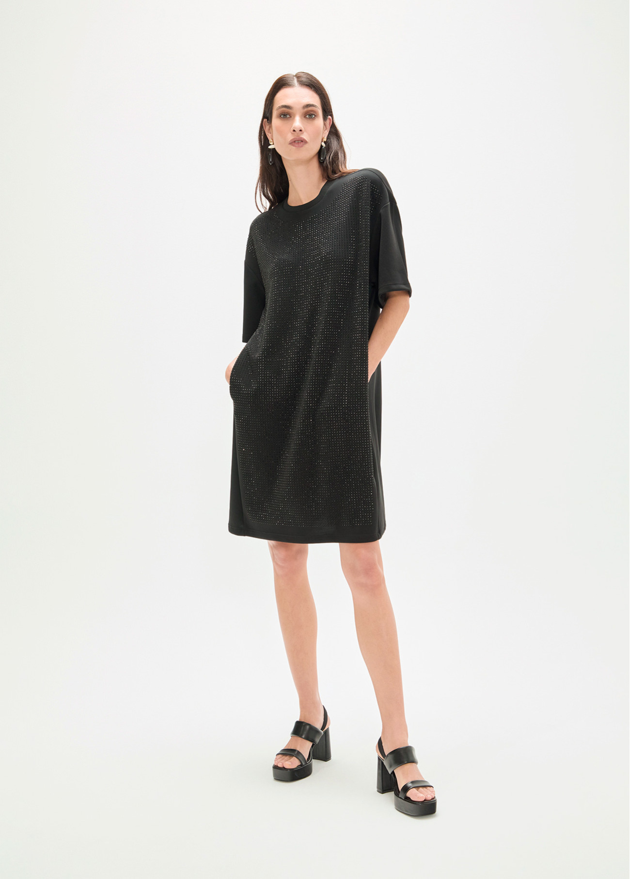 Schwarzes T-Shirt-Kleid mit Strass-Details an der Vorderseite. Kurze Ärmel und gerader Schnitt für einen modernen, legeren Look. Perfekt für informelle Ausflüge oder Abendveranstaltungen.