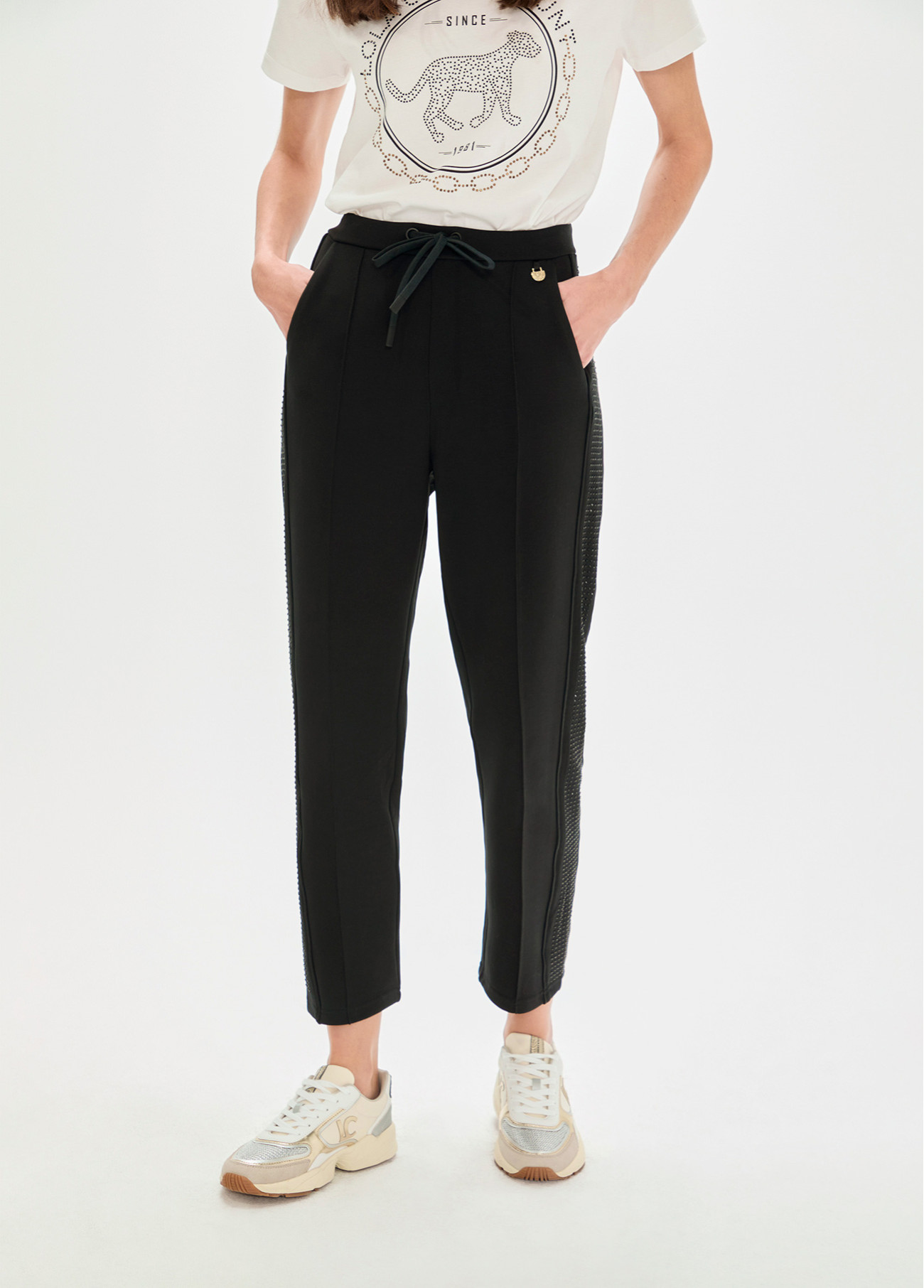 Hose aus Scuba-Stoff mit eleganten Strass seitlich. Modernes Design mit elastischem Bund und verstellbarem Kordelzug für Komfort. Ideal für einen lässigen Look mit einem Hauch von Eleganz dank seines funkelnden Details. Erhältlich in Schwarz.