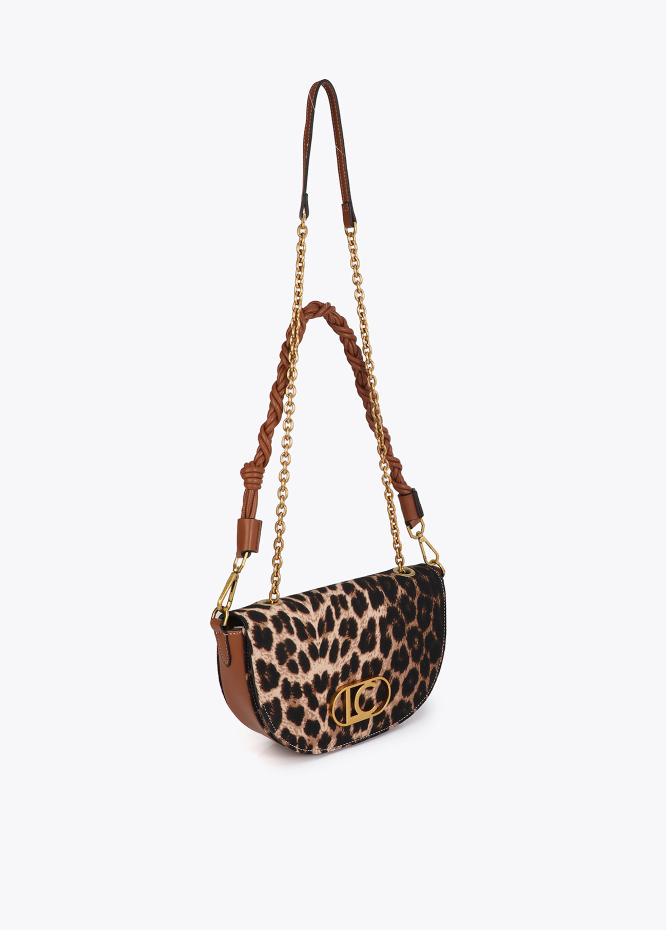 Halbmond Tasche mit Leopardenmuster und Kunstleder-Effekt. Goldene Kettenhenkel und geflochtener Kunstlederriemen. Magnetverschluss und geräumiges Innenfach. Ein gewagtes und stilvolles Accessoire für jeden Tag.