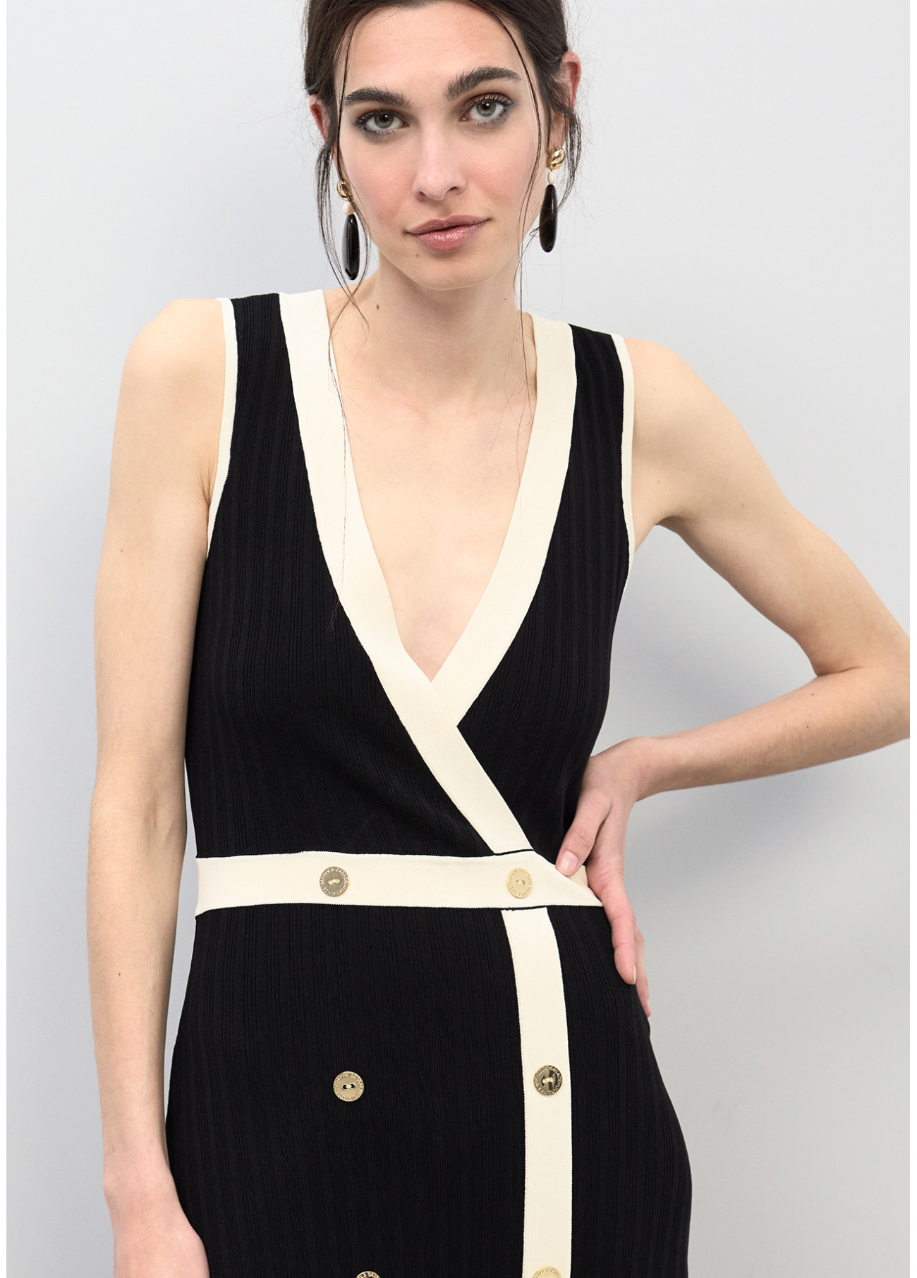 Midi-Kleid mit elegantem V-Ausschnitt und Kontrastdetail an der Taille und dekorativen Knöpfen. Ärmelloser Schnitt, leichter Stoff, ideal für anspruchsvolle Veranstaltungen. Ein Must-Have in jeder modernen Garderobe in vielseitigen Farbtönen erhältlich.