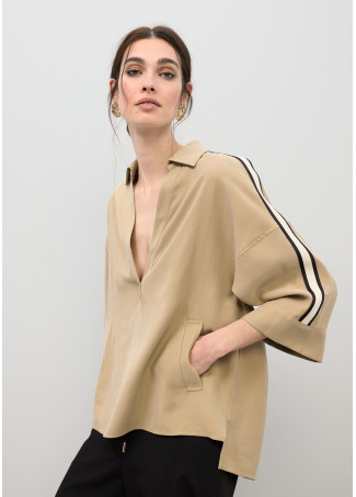 Beiges Hemdblusenkleid mit offenem Ausschnitt und 3/4 Ärmeln. Kontrastierende Details an den Schultern. Weiter Schnitt mit Seitentaschen für einen lässigen, eleganten Look.