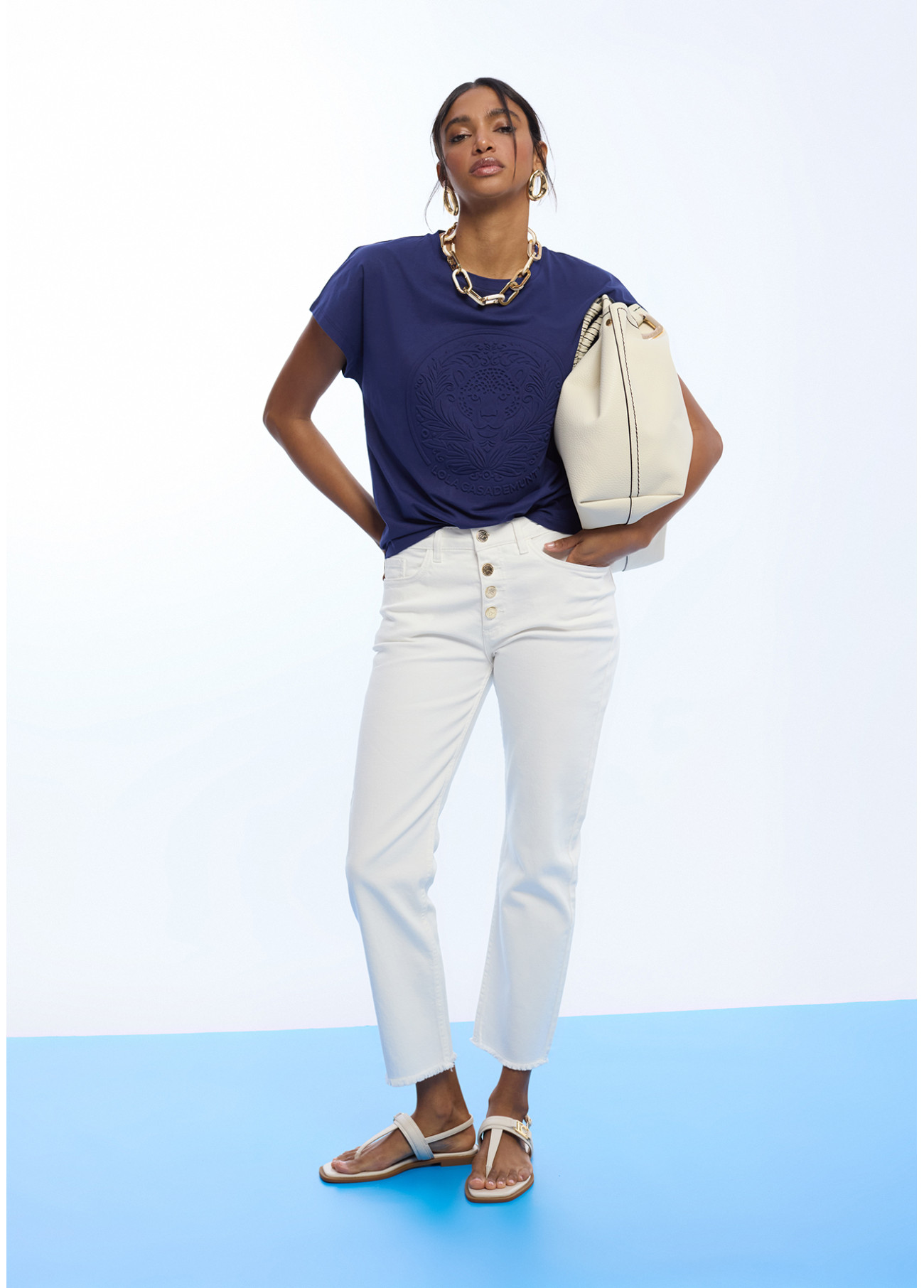 Kurzarm-T-Shirt in tiefem Blau mit Relieflogo auf der Vorderseite. Aus hochwertiger Baumwolle für extra Komfort gefertigt. Perfekt für einen lässigen, schicken Look.