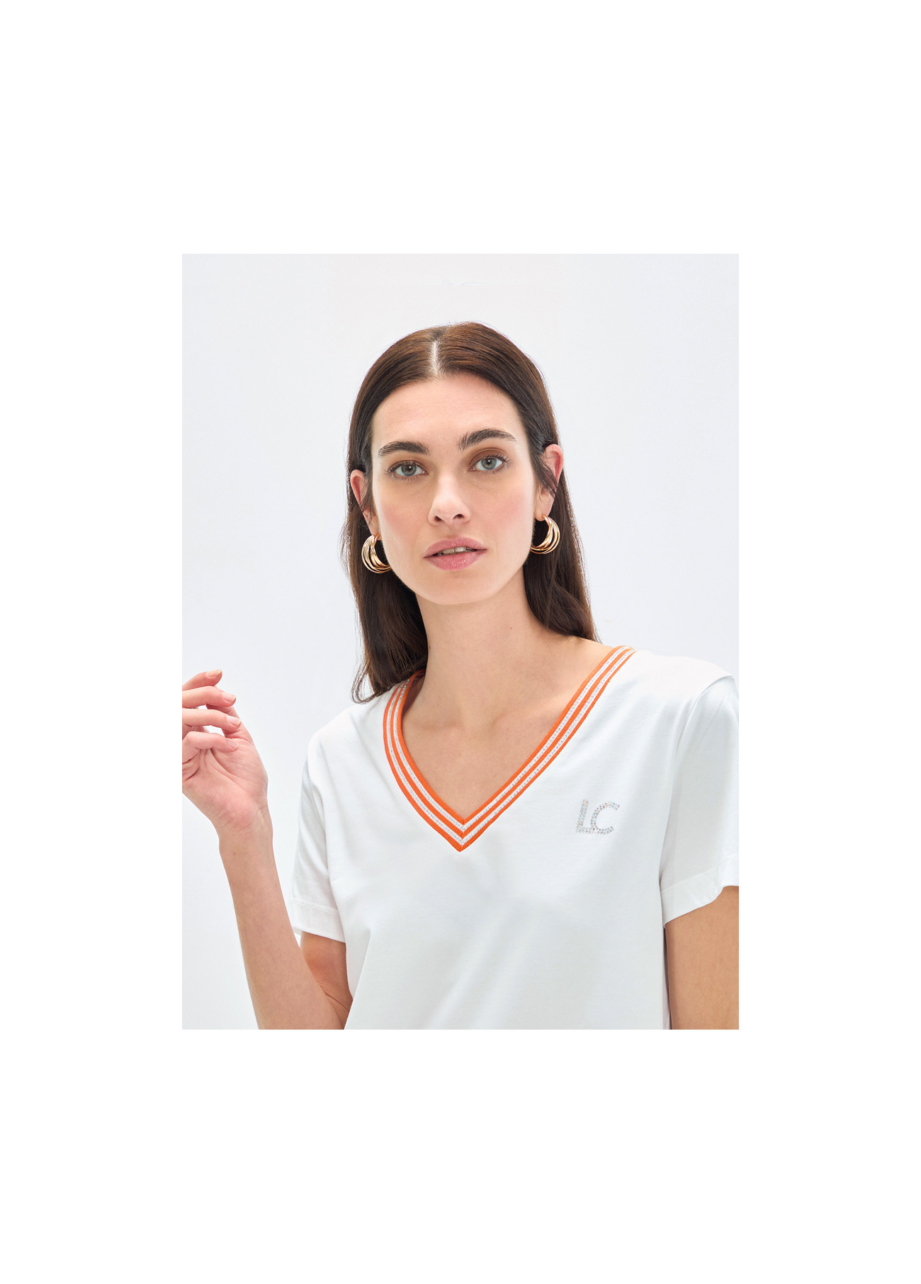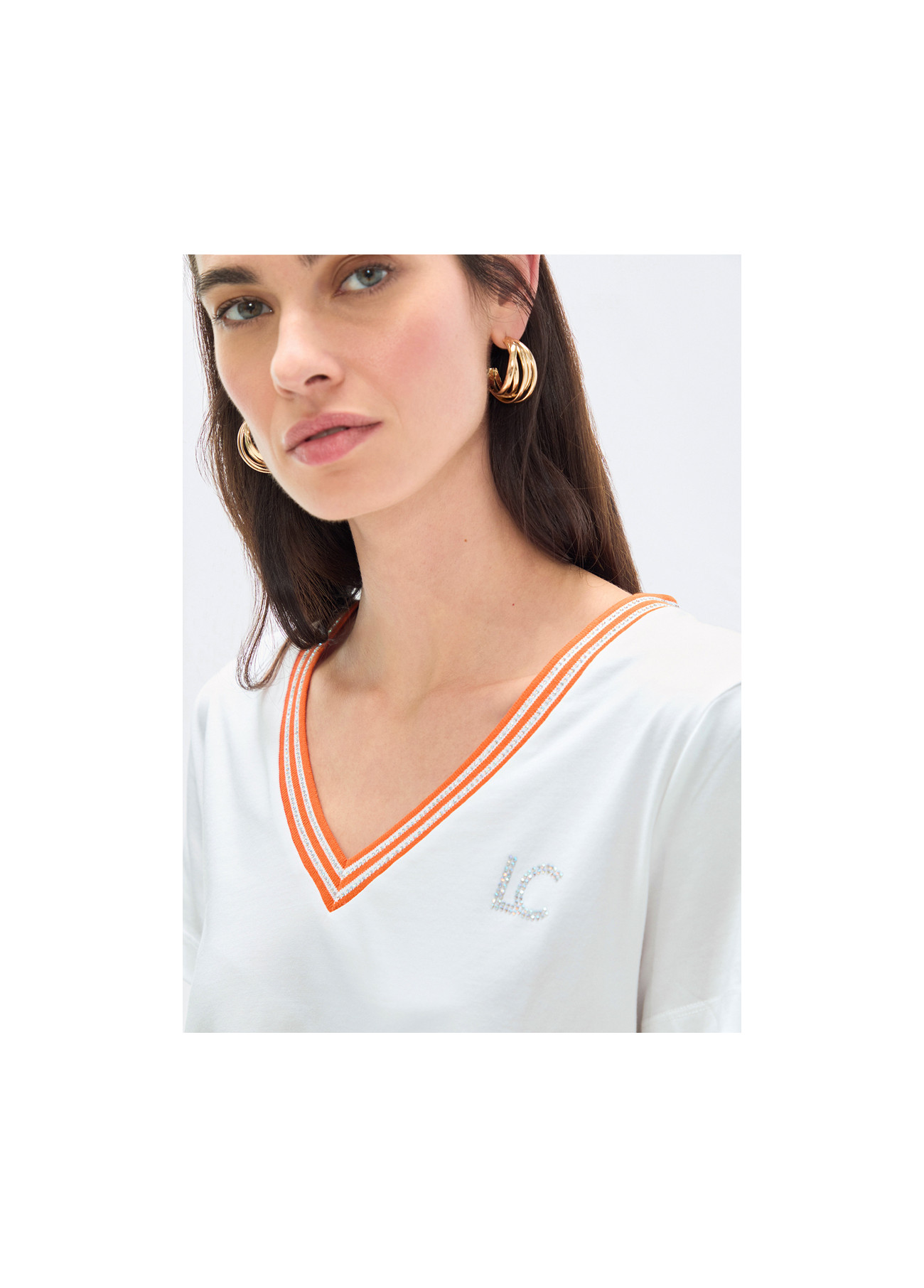Baumwoll-T-Shirt mit V-Ausschnitt, betont durch ein zweifarbiges Band. Bequeme kurze Ärmel mit gesticktem Logodetail. Perfekt für einen vielseitigen und modernen Freizeitlook.