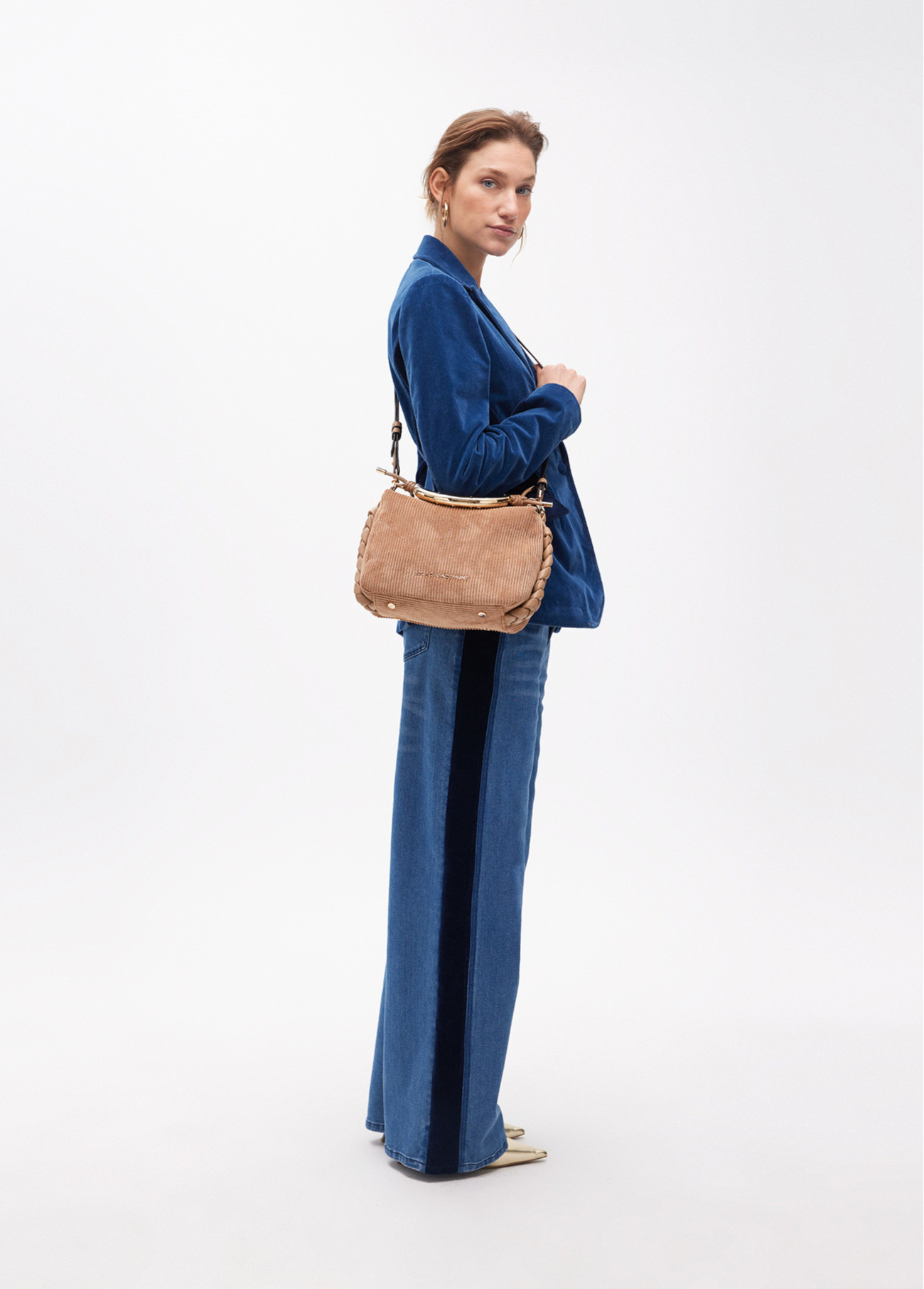 Umhängetasche aus Samt mit personalisiertem Metallgriff und graviertem Logo. Verstellbarer Gurt und geflochtene Details an den Seiten. Geräumiges Inneres mit funktionalen Fächern. Sicherer Reißverschluss oben.