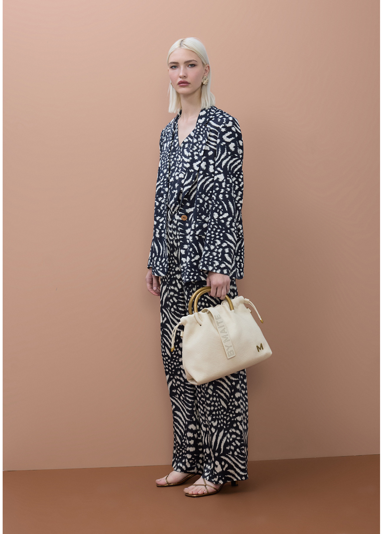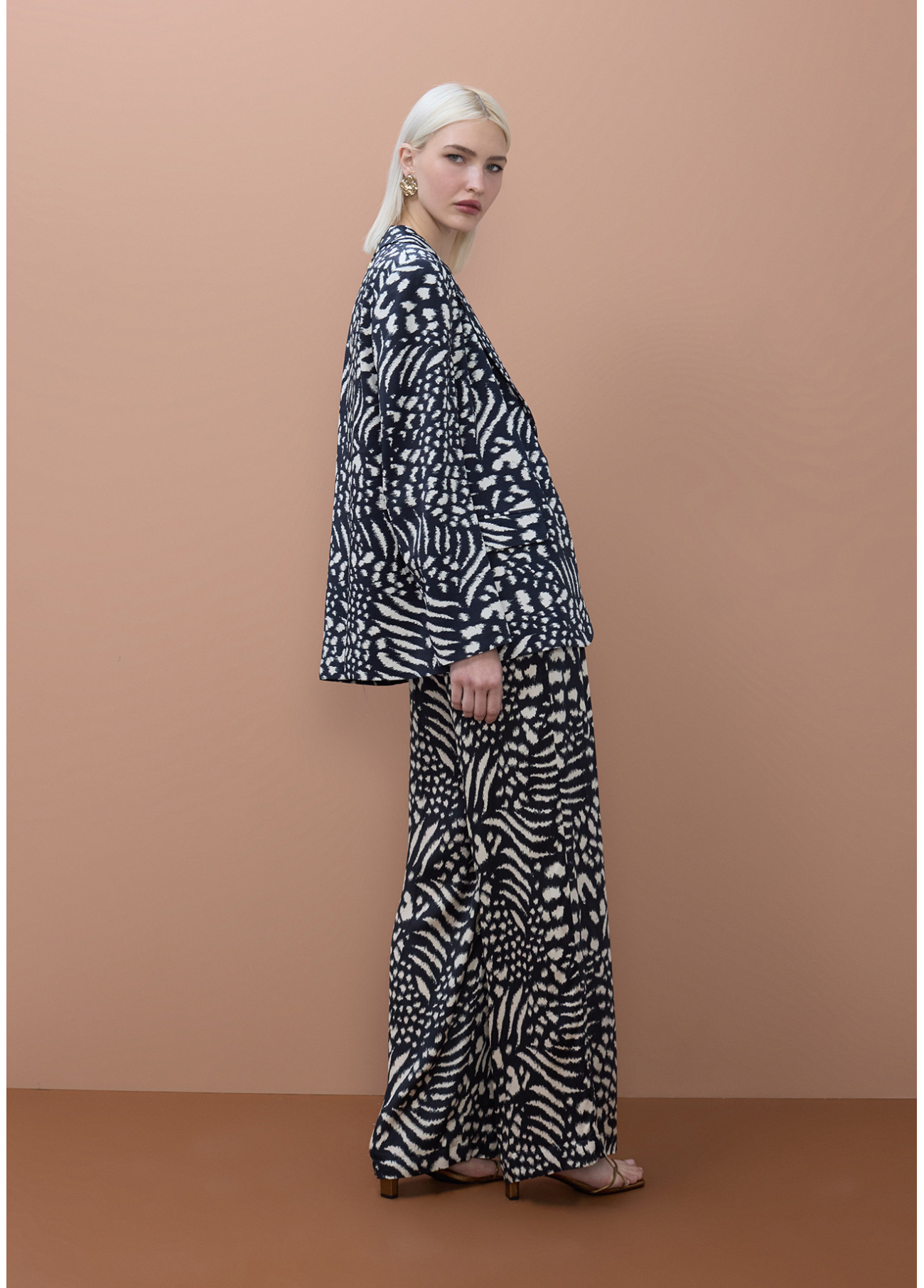 Fluid blazer with a vibrant abstract print. Made from lightweight fabric. Perfect for a chic and comfortable look. Features classic lapels and a discreet front closure. Perfect to enhance any outfit with a touch of sophistication and modernity.