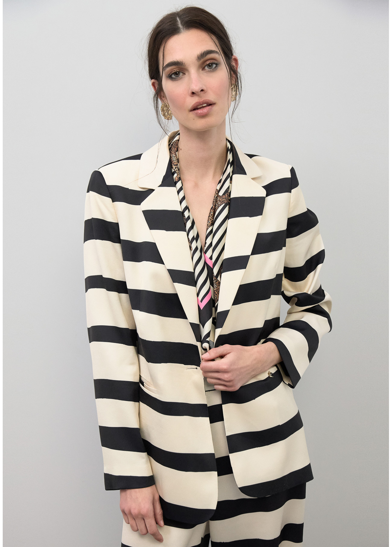 Fluid satin blazer with elegant horizontal stripes. Crafted in soft fabric for perfect drape. Classic lapel and golden button closure. Ideal for a modern and sophisticated style.