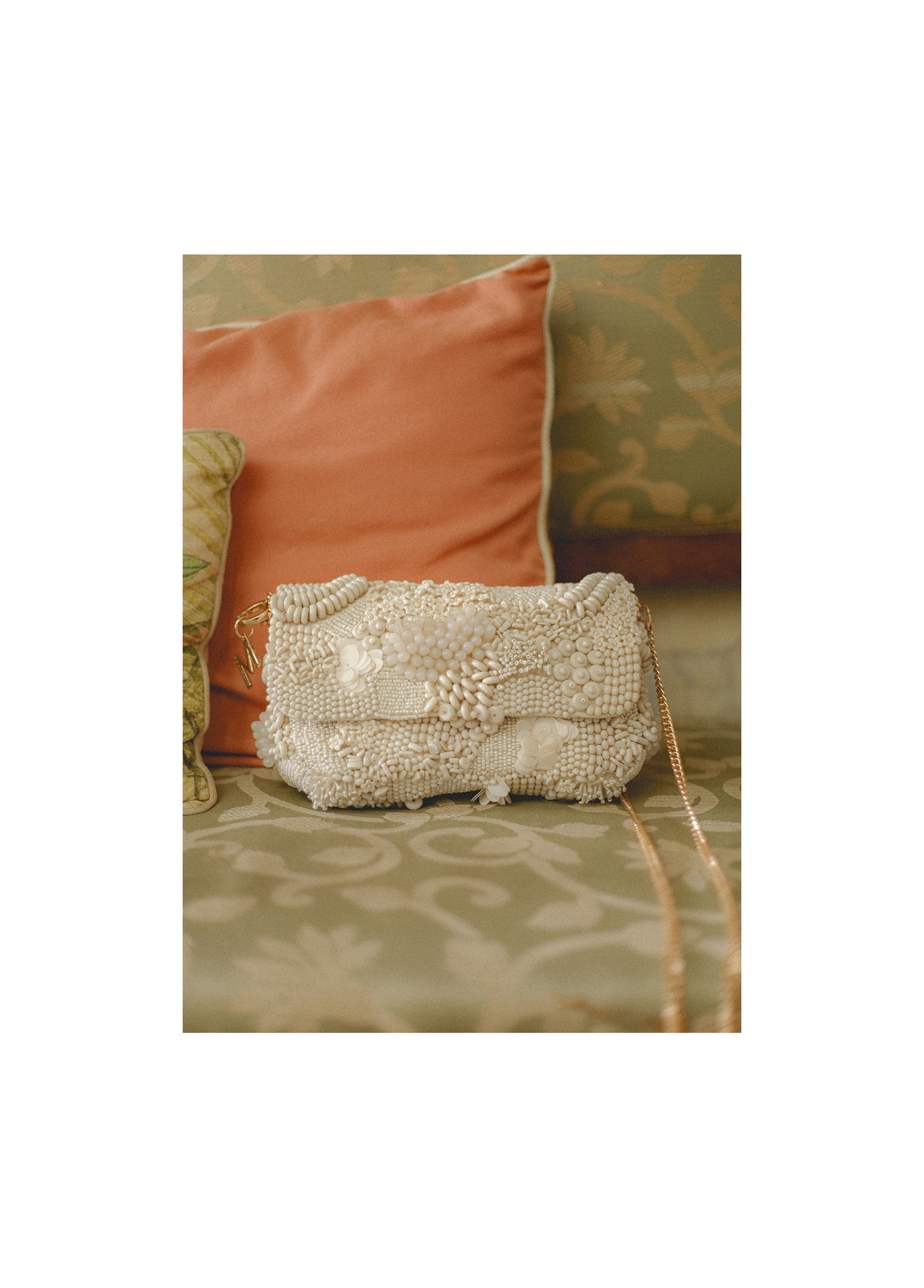 Baguette bag styled with tonal beads. Compact design with magnetic closure and removable gold chain. Perfect for carrying essentials stylishly.
