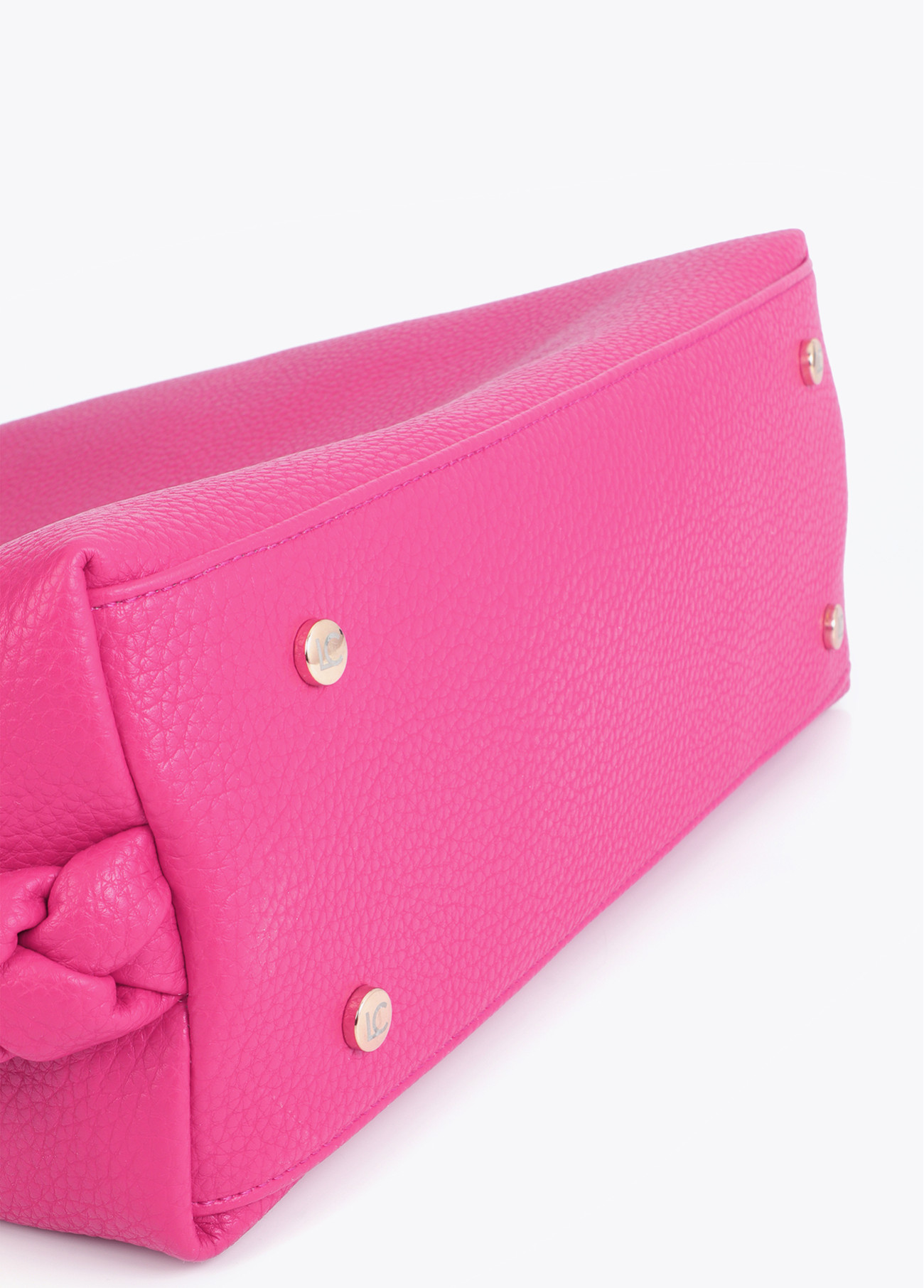 Vibrant pink shopper with a detailed gold cutout metallic handle. Spacious design with braided side finishes and magnetic closure. Perfect for adding a modern, colorful touch to any outfit.