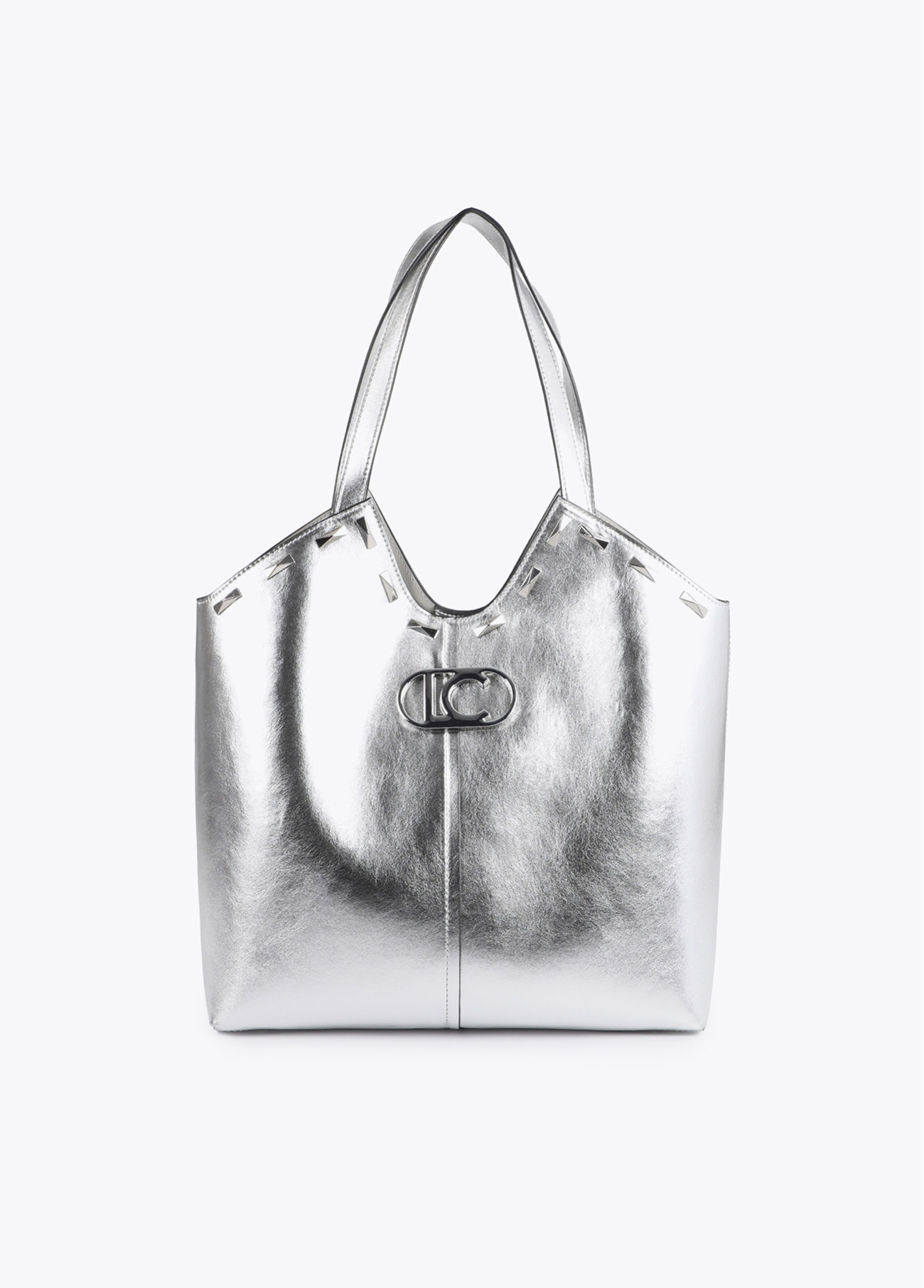 Metallic finish shopper with modern rectangular studs. Spacious interior with organizer pocket. Double handles and front metallic logo detail. Perfect for a chic urban look.