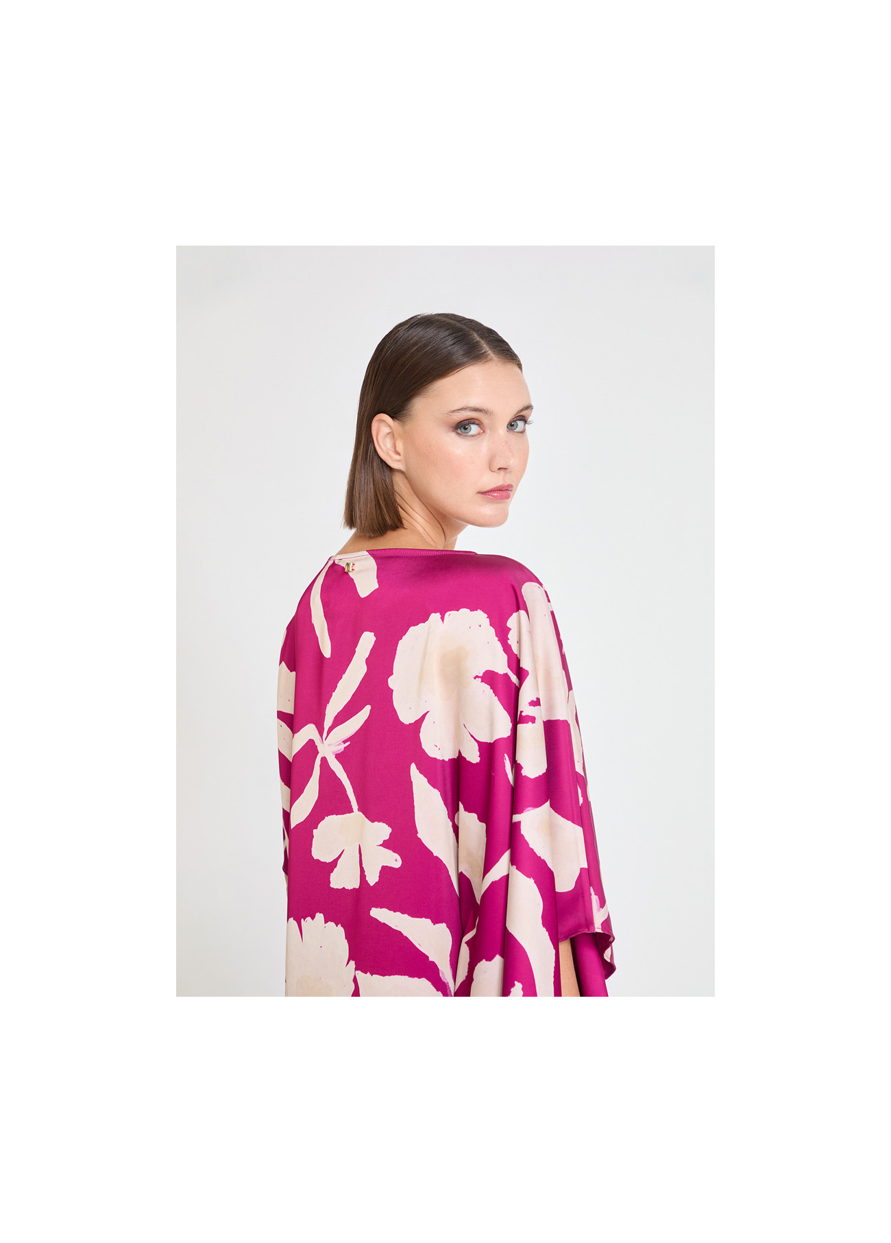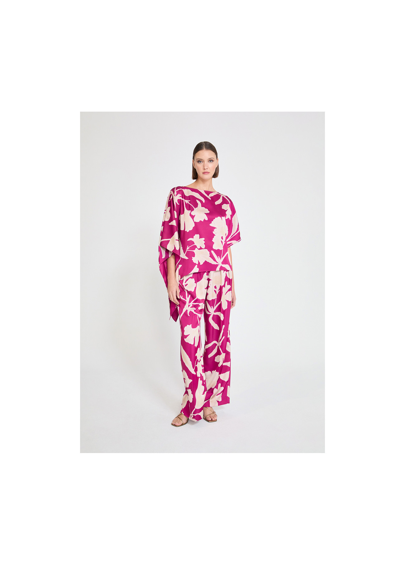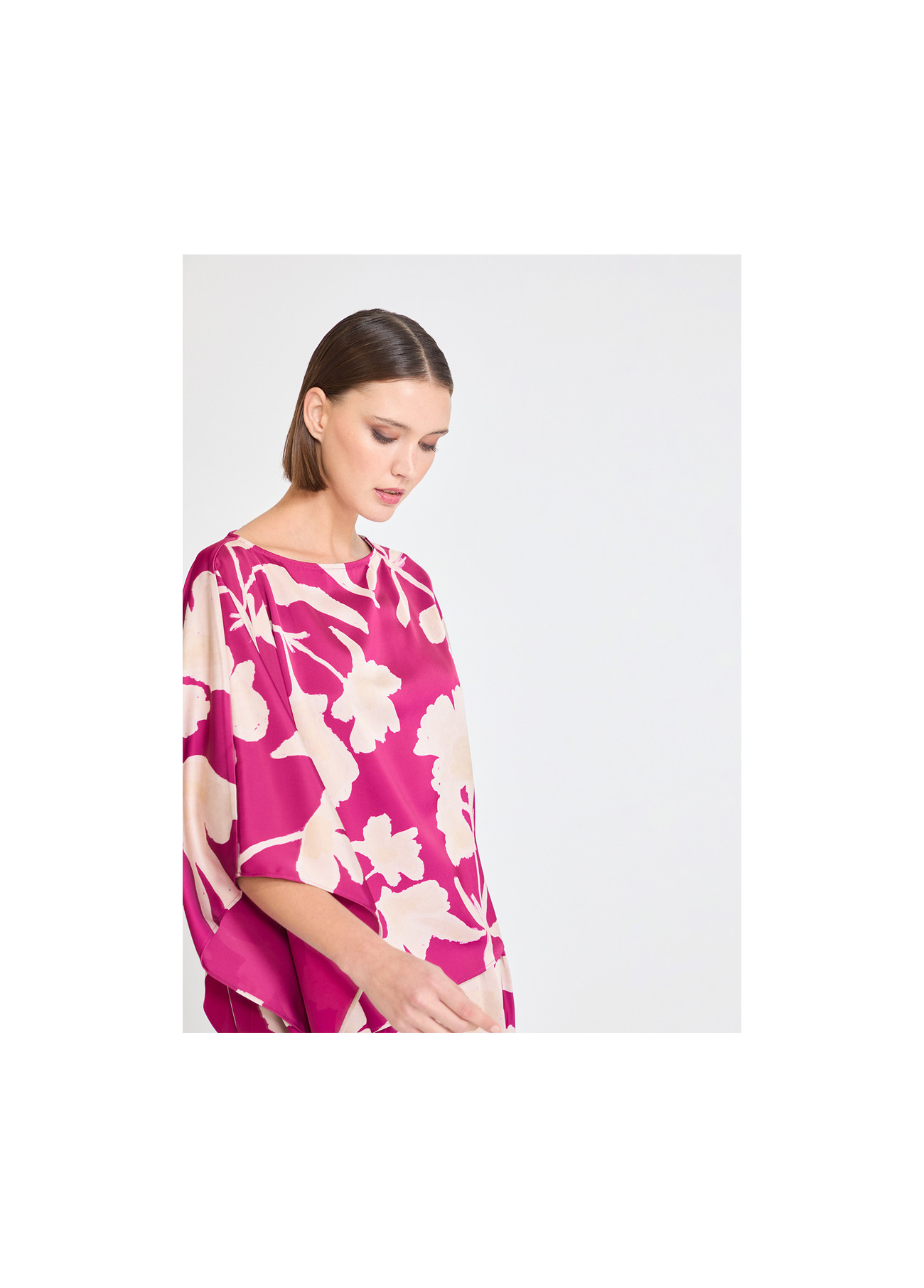 Asymmetric sleeve blouse in bougainvillea with large floral print. Made from high-quality lightweight fabric, it offers a flowing and sophisticated drape. Ideal for both formal and casual looks. Delight in its bold and elegant design.