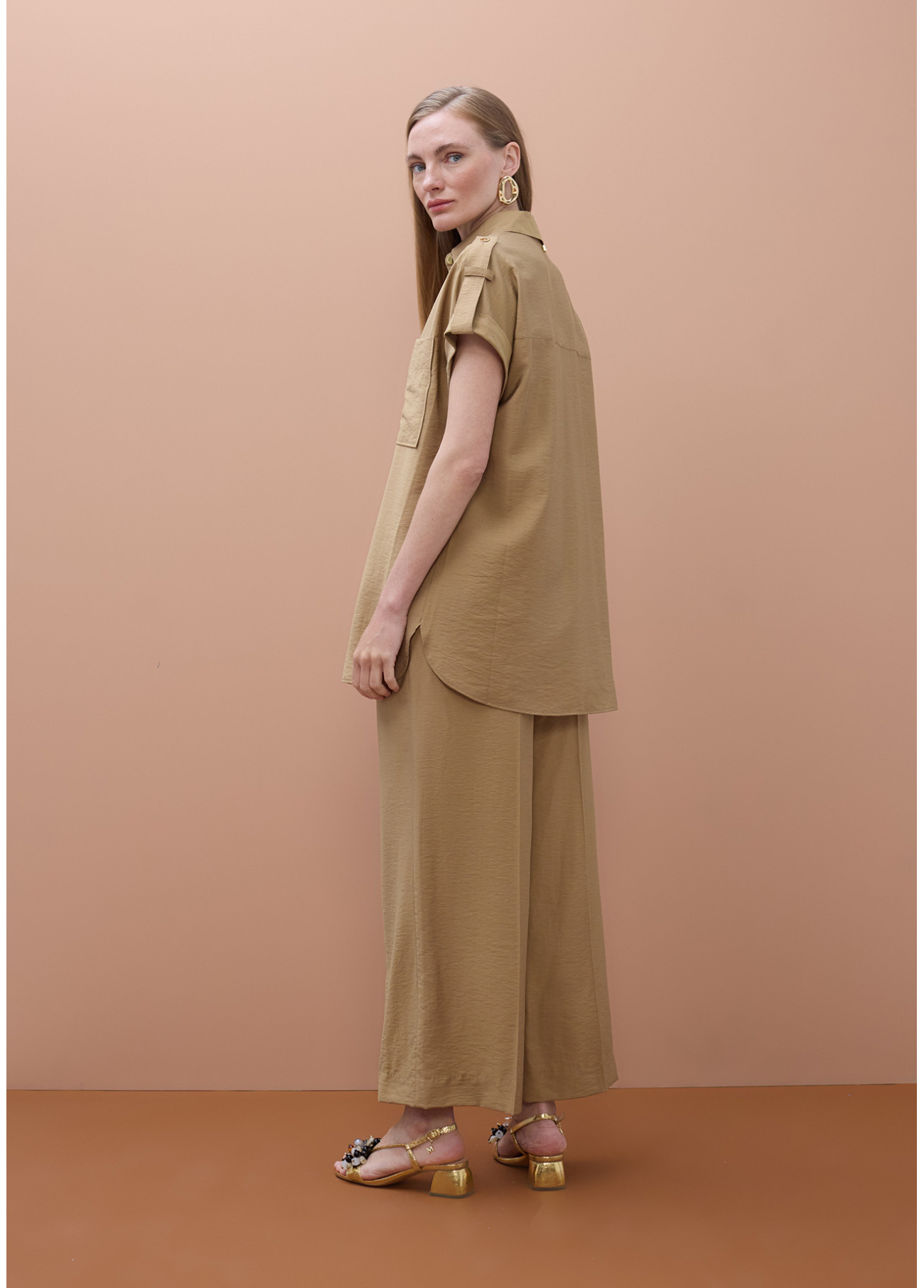 Versatile sleeveless shirt with large front pockets. Made from lightweight, fluid fabric, perfect for warm weather. Gold button details on the shoulders and classic collar add a sophisticated touch. Available in a neutral tone ideal for any occasion.