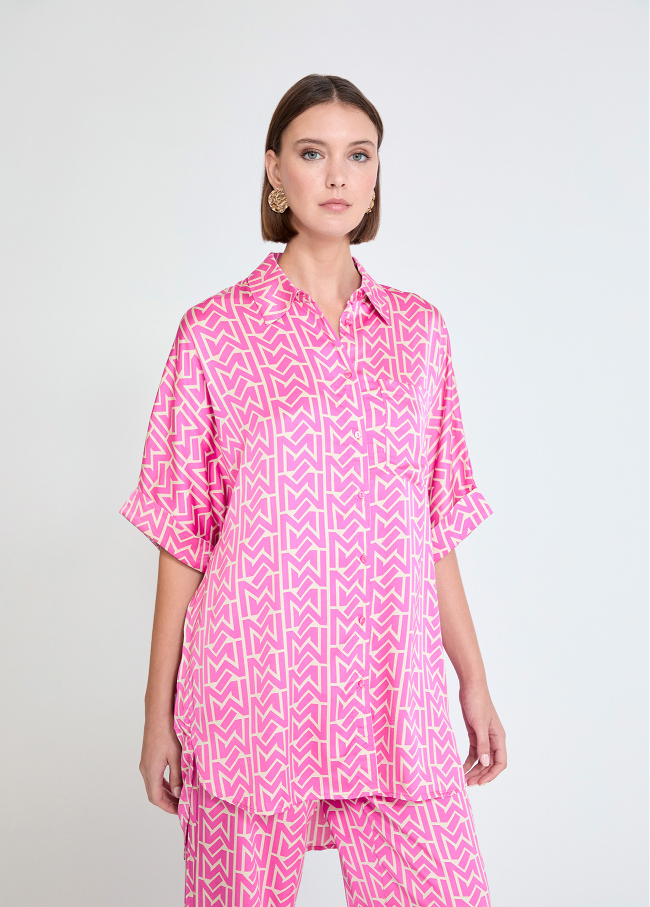 Short sleeve satin shirt with geometric print in pink tones. Features a classic collar and a chest pocket with a discreet logo. Perfect for an elegant casual look.