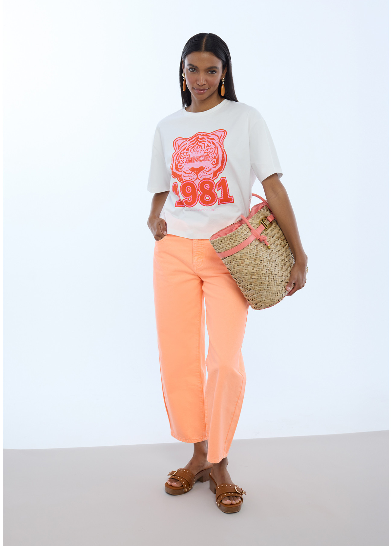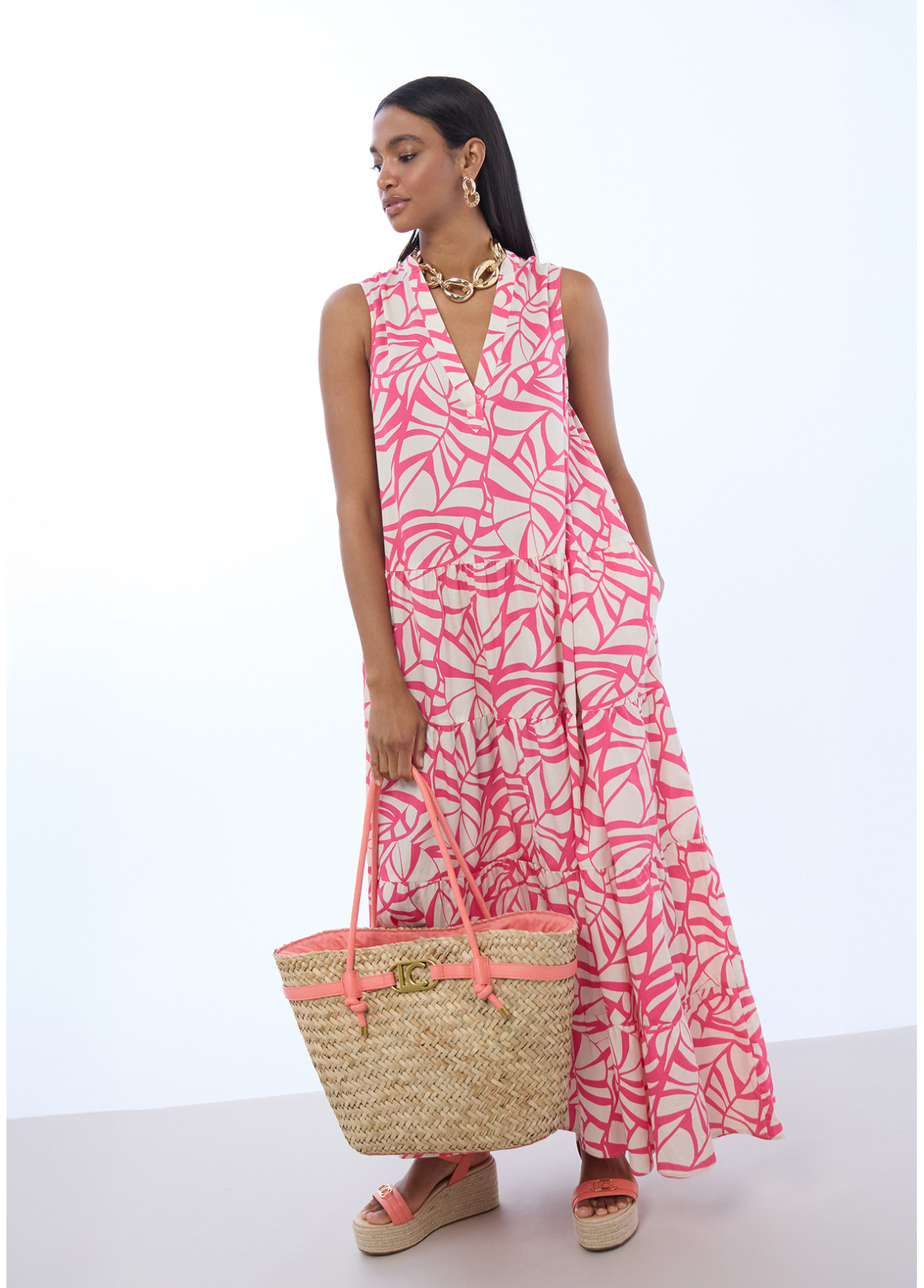 Stylish raffia basket with long handles and faux leather details. Equipped with adjustable closure and fabric lining. Perfect for carrying your essentials in style for both urban outings and beach trips.