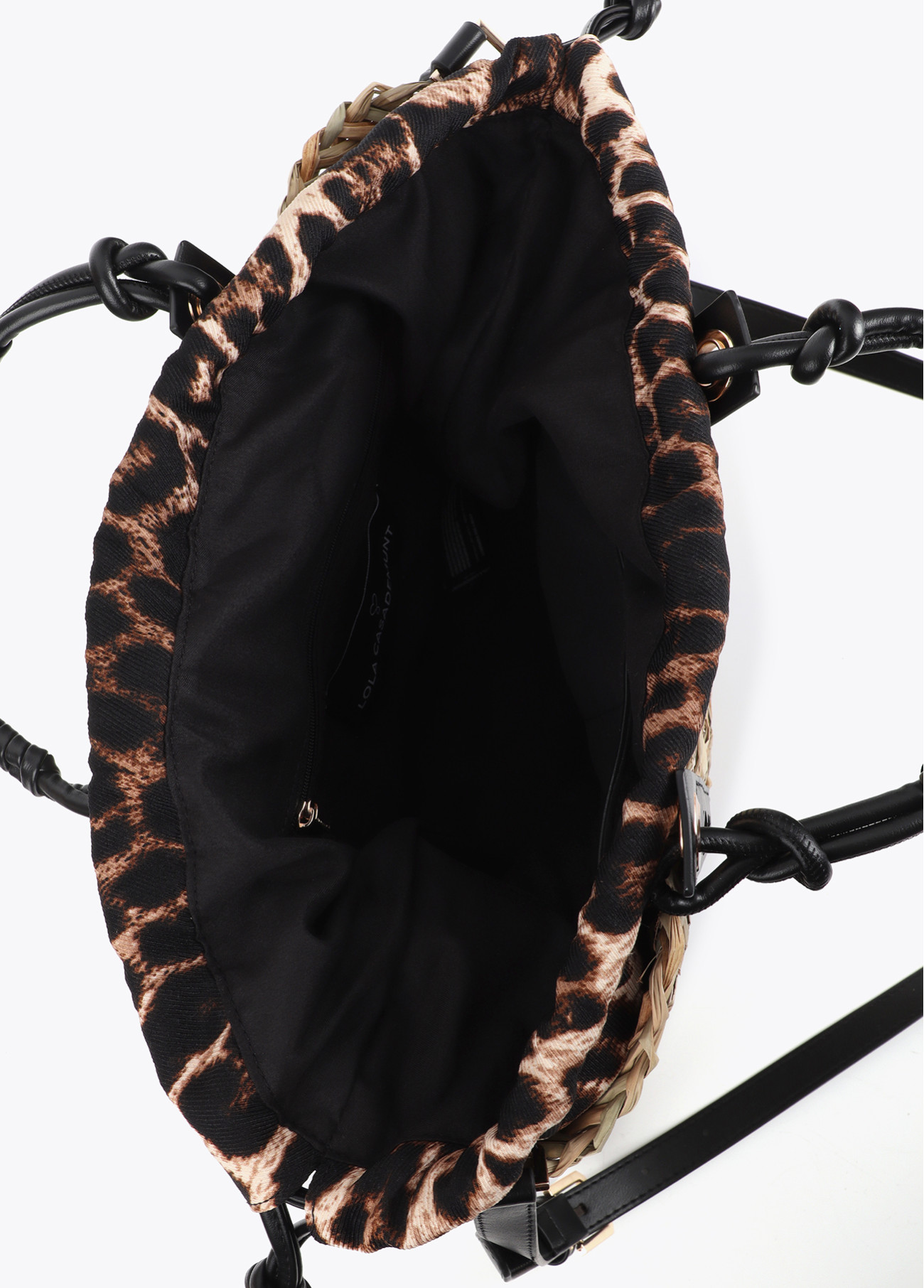 Mini basket made of natural fiber with perforated leather handles featuring the Lola Casademunt logo. Compact and lightweight design, ideal for carrying summer essentials. Includes inner lining with secure closure.