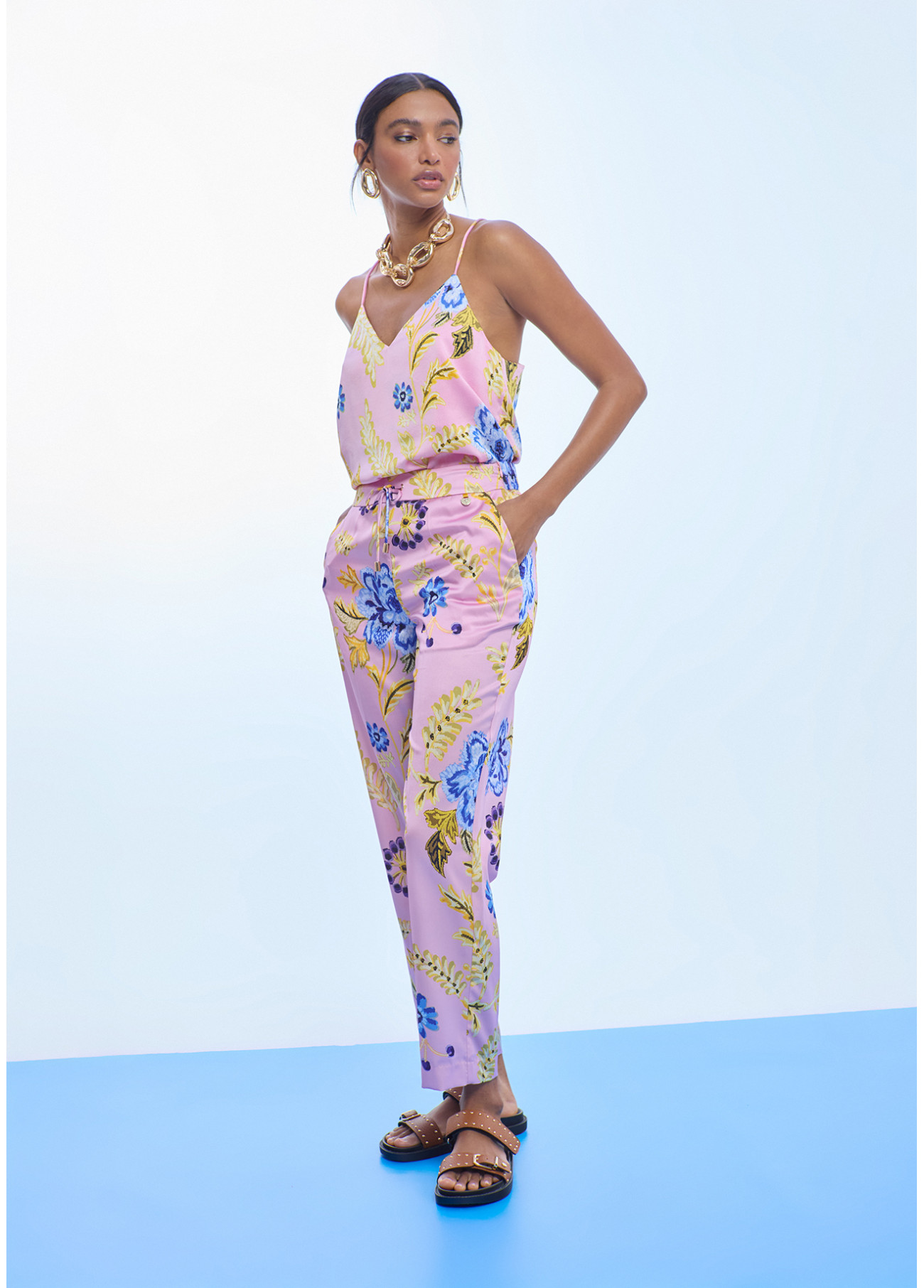 Fluid jogger crafted in soft satin with vibrant floral print. Elastic waistband with adjustable drawstring. Side pockets for added comfort. Perfect for adding a fresh and stylish touch to your everyday look.