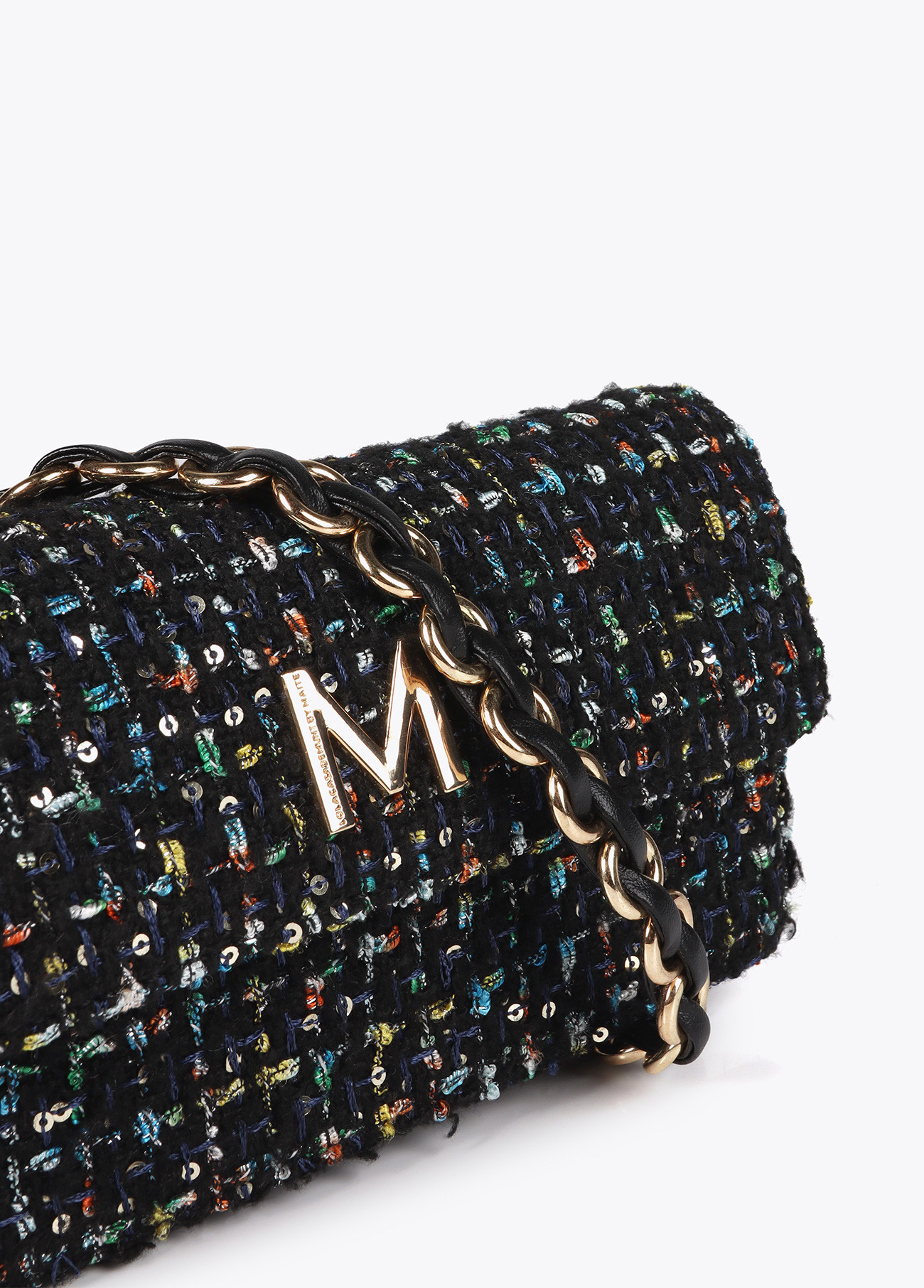 Elegant multicolored tweed crossbody with gold chain and front logo. Compact bag with magnetic closure and lined interior compartment.