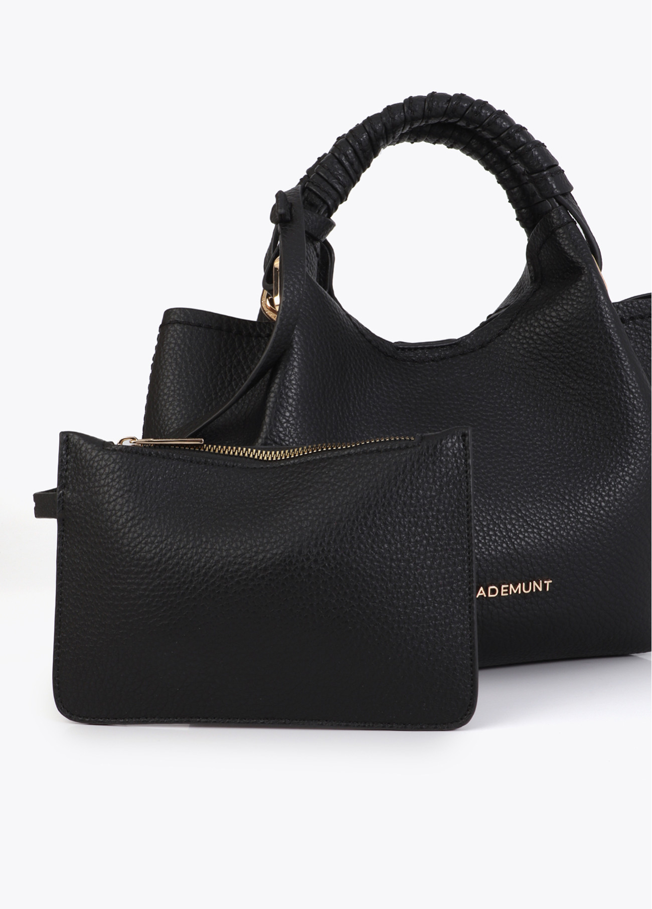Small crossbody bag made of elegant synthetic leather. Features a braided handle and gold metallic details. Includes a detachable strap and a practical interior zip pocket. Compact and versatile, perfect for everyday use.