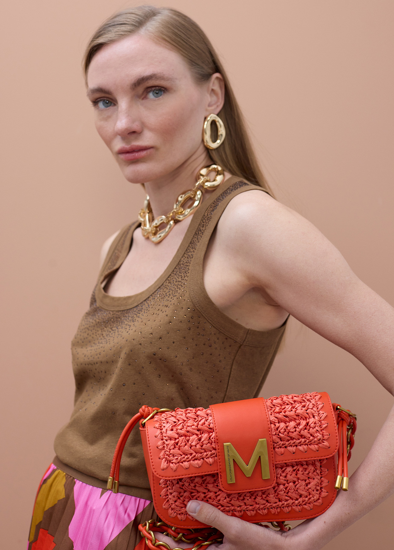 Compact crossbody bag combining raffia and faux leather in a vibrant hue. Features a gold chain detail and flap closure. Lined interior with extra compartment for organization.