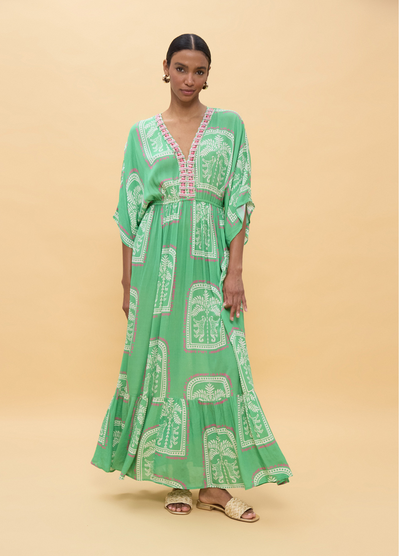 Long dress with a Thai-style print in green and pink tones. Made from a fluid fabric, features wide sleeves and a V-neck with embroidered details. Perfect for a casual chic look.