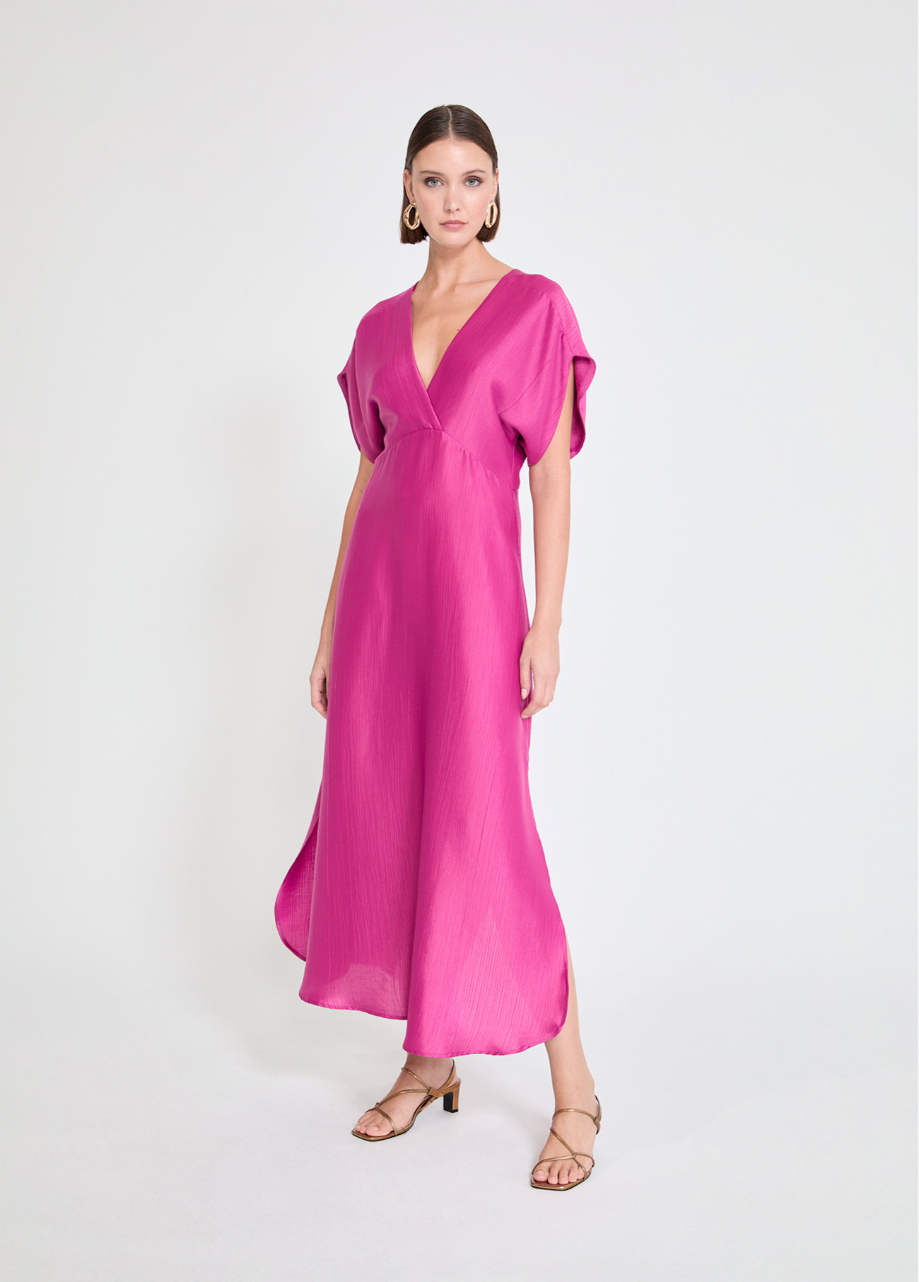 Soft textured dress with V-neck and short sleeves. Fluid cut and elegant drape perfect for summer. Ideal to highlight any figure with its sophisticated design.