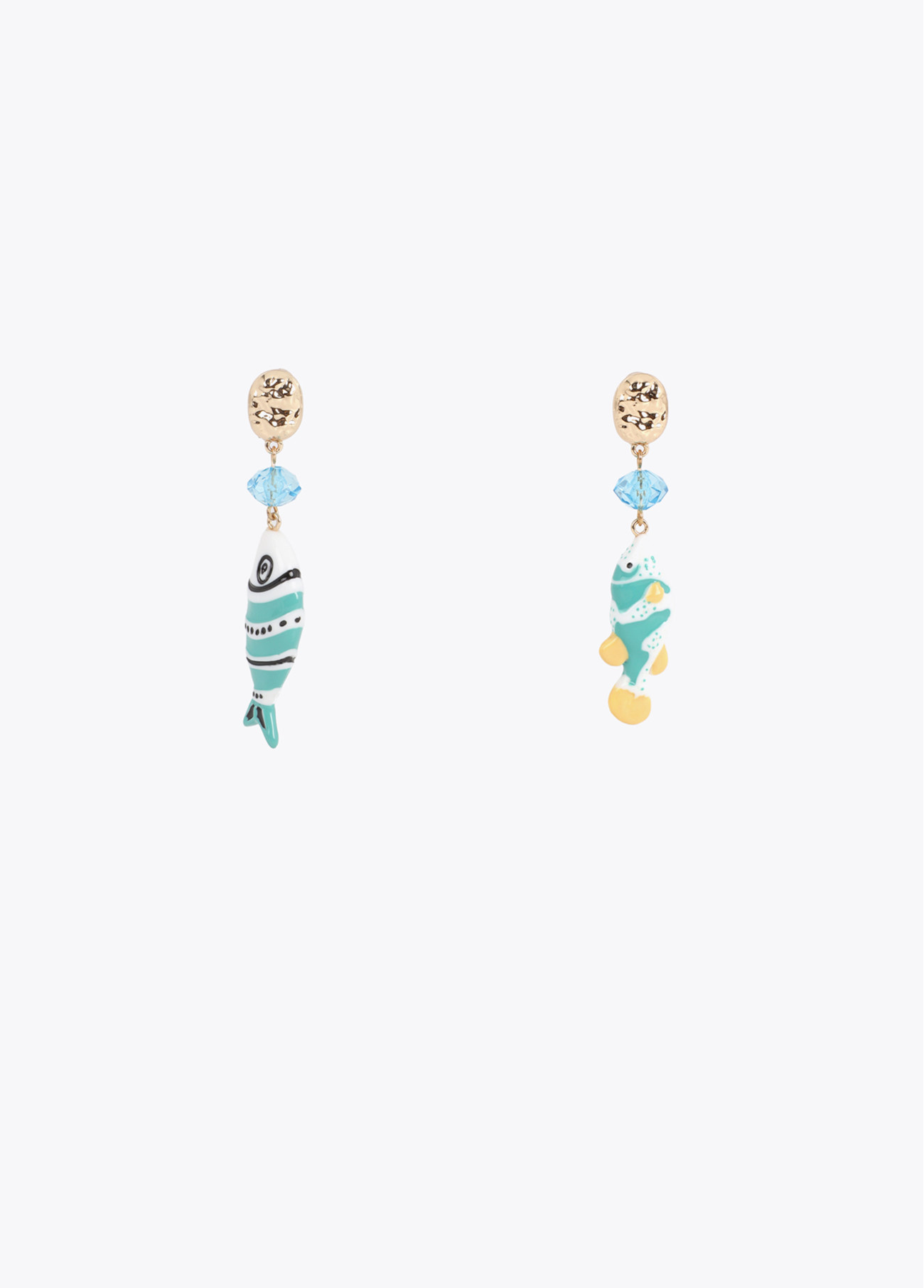 Eye-catching earrings with irregular design and multicolor fish motif. Made of gold-tone metal with bluish crystal beads. Secured with a stud back closure.