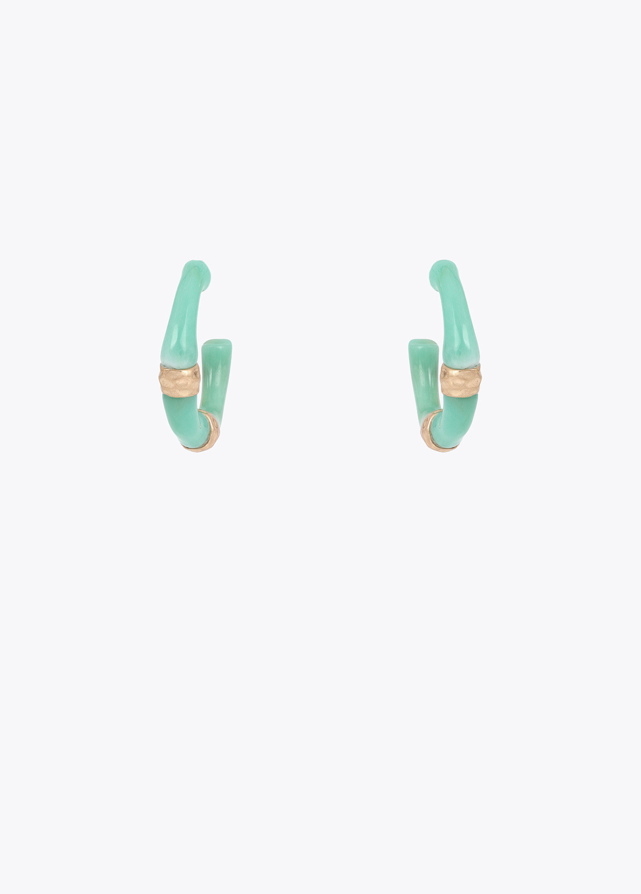 Hoop earrings featuring a bamboo effect finish with golden details. Their green color is perfect to add a tropical touch to your daily look. Secure screw-back closure for safety and comfort.