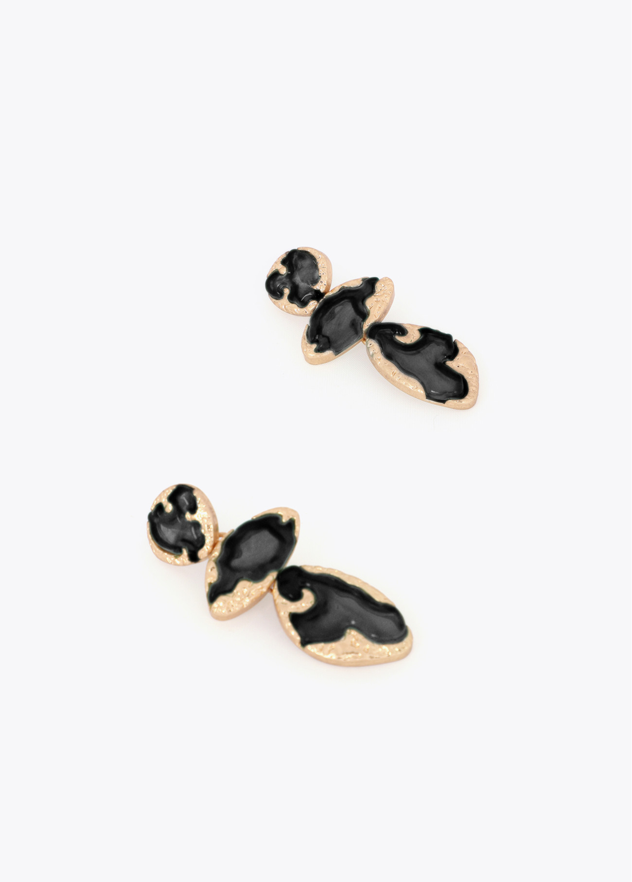 Large earrings with a metallic and lacquered design. Features organic shapes in dark tones and gold finish. Comfortable push-back closure. Ideal to elevate any look.