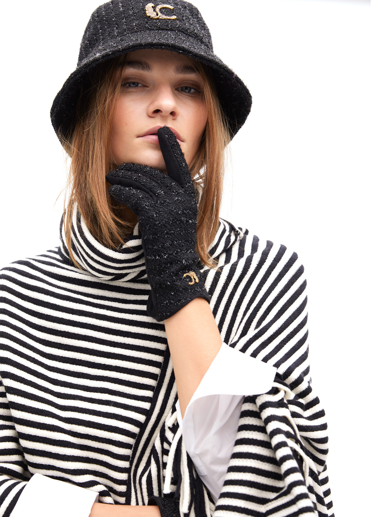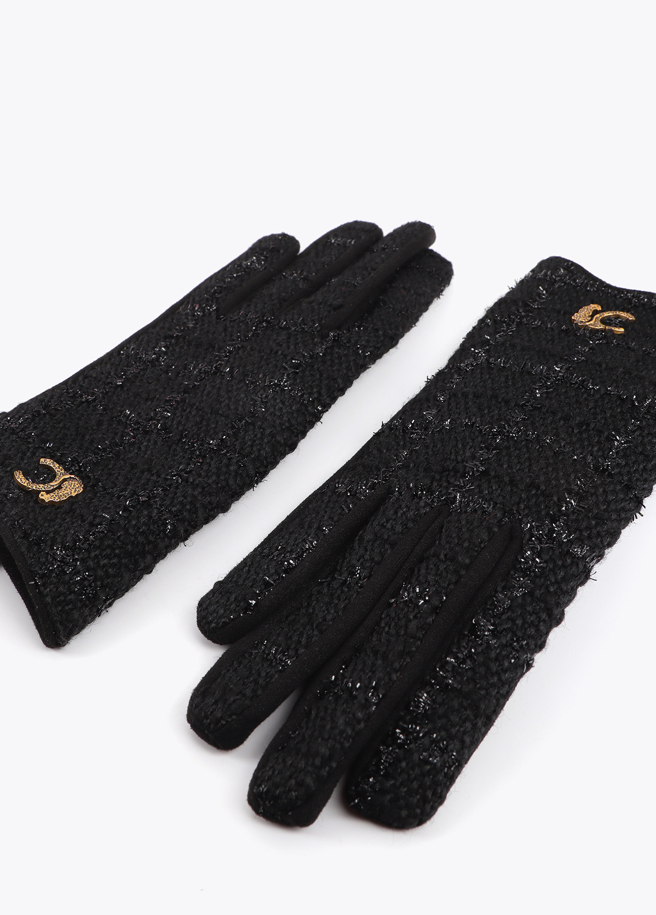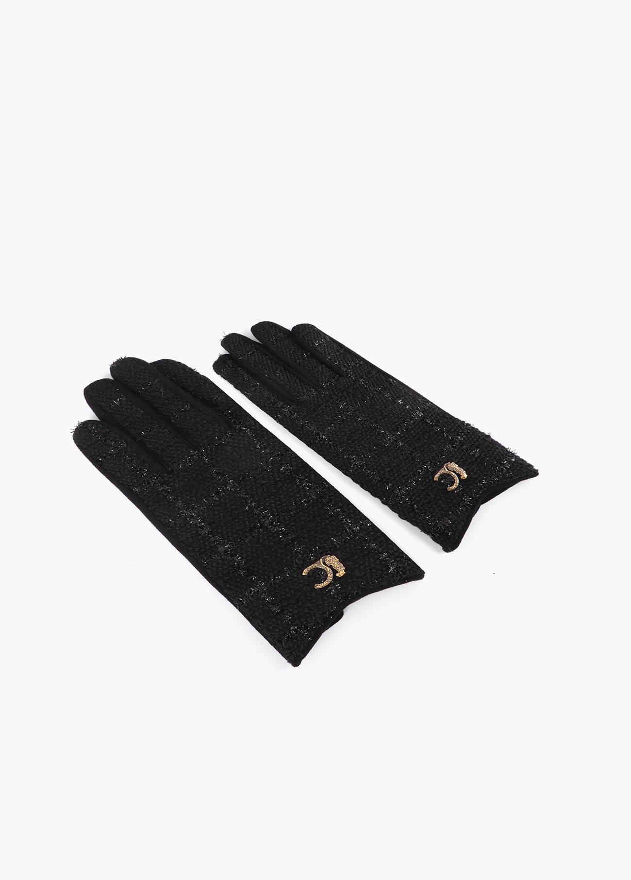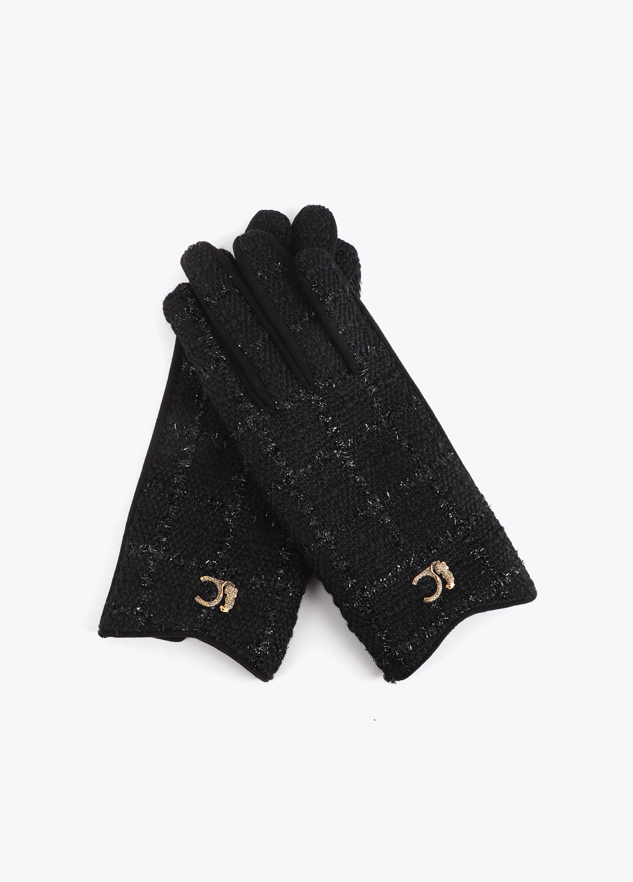 Elegant combined gloves in black tweed fabric with golden details. Fitted design for comfortable wear. Ideal for a sophisticated and modern look.