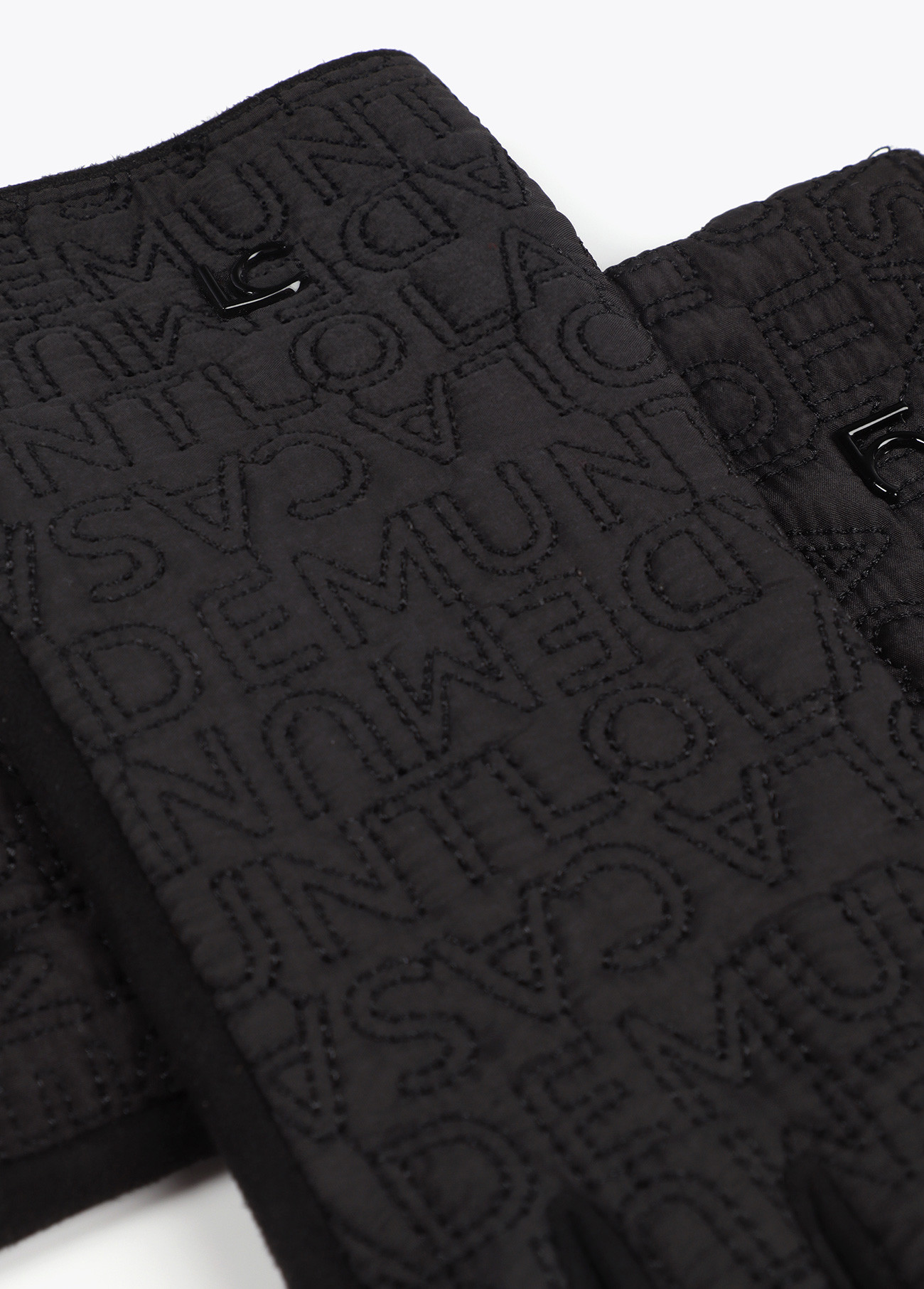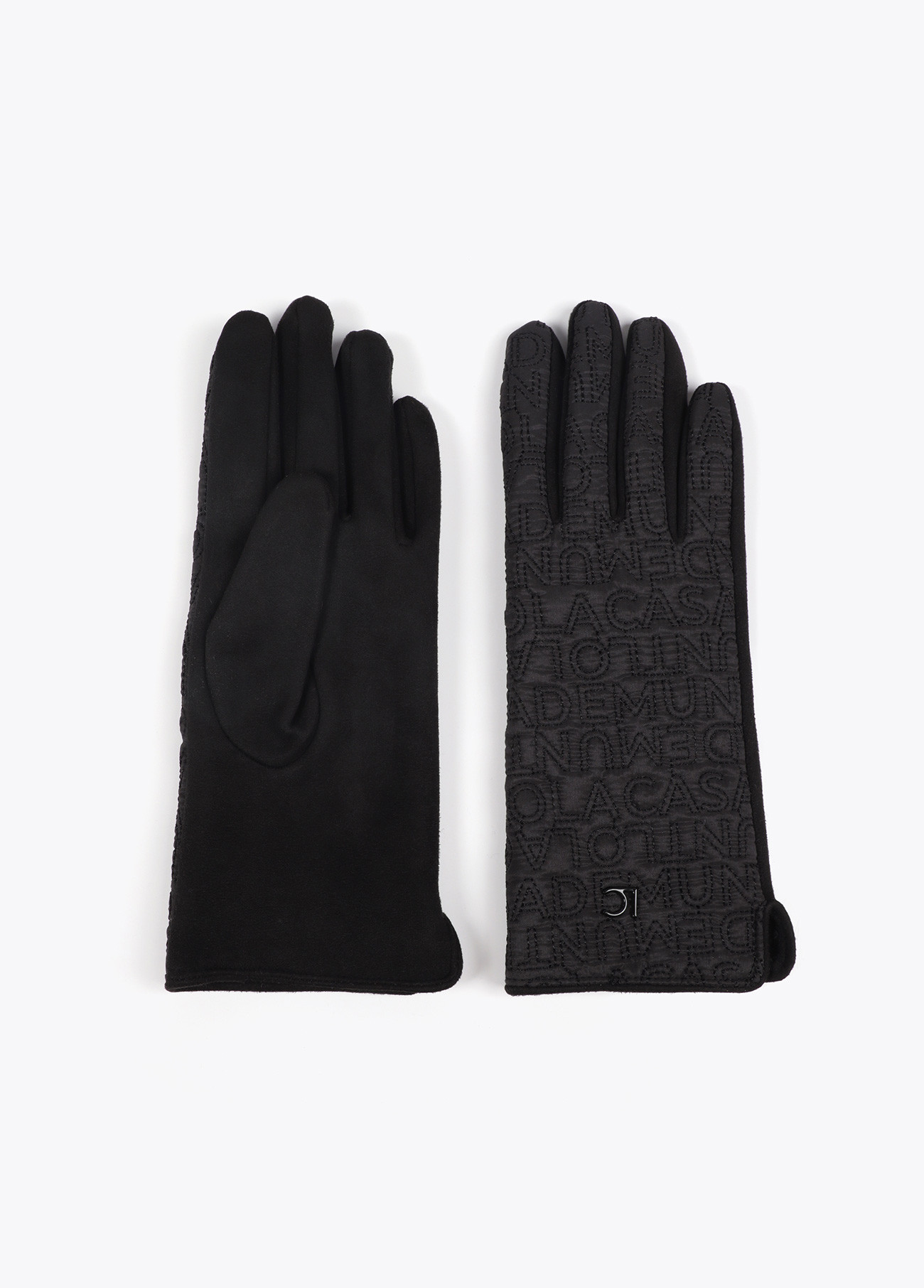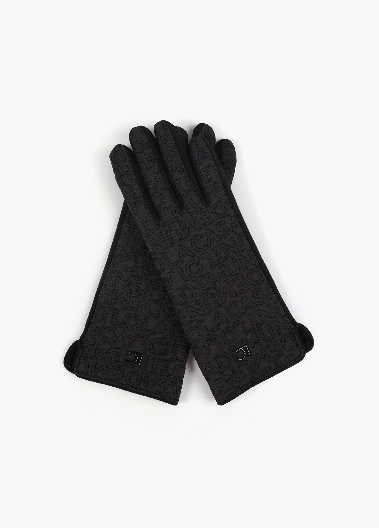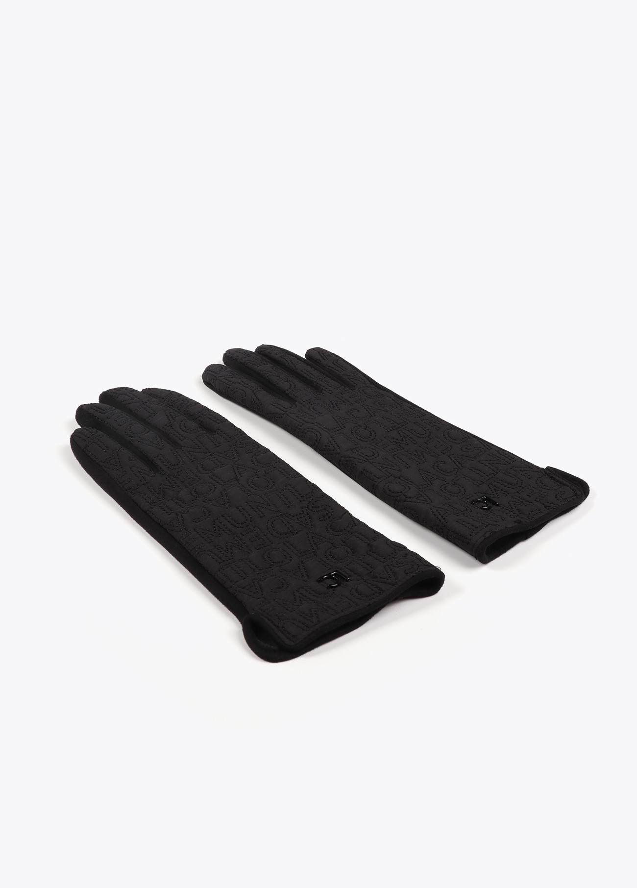 Elegant gloves with embroidered logo, made from soft, warm fabric. Fitted design with metallic logo detail. Perfect for adding a sophisticated touch to your winter look.