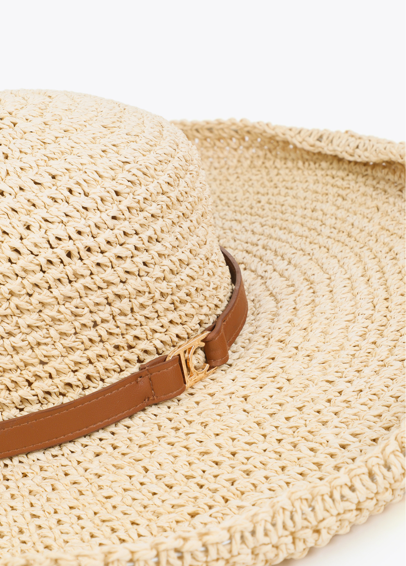 Wide brim hat designed in raffia effect, lightweight and breezy. Perfect for a summer look. Features an elegant brown band with gold detail, ideal for stylish sun protection.