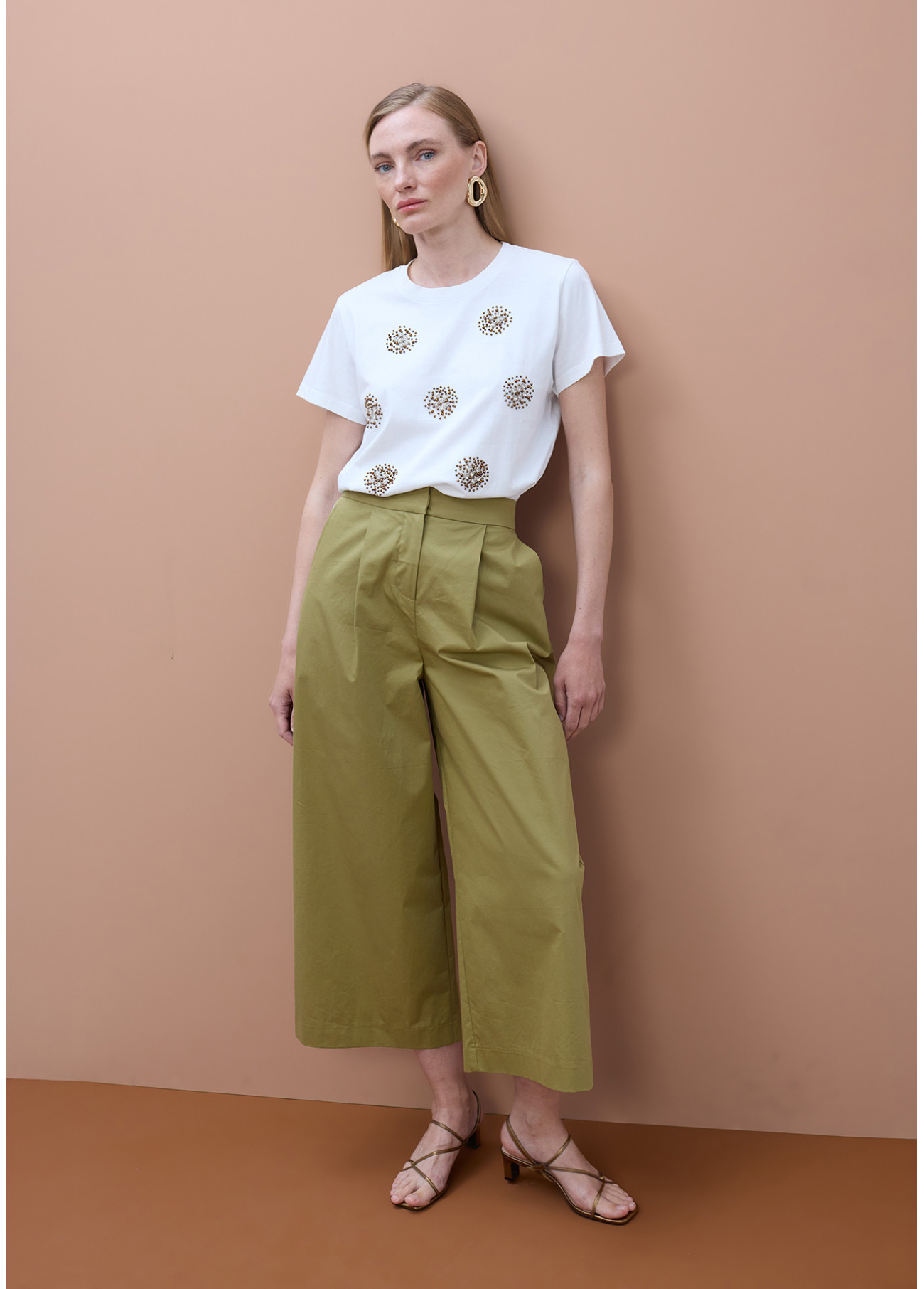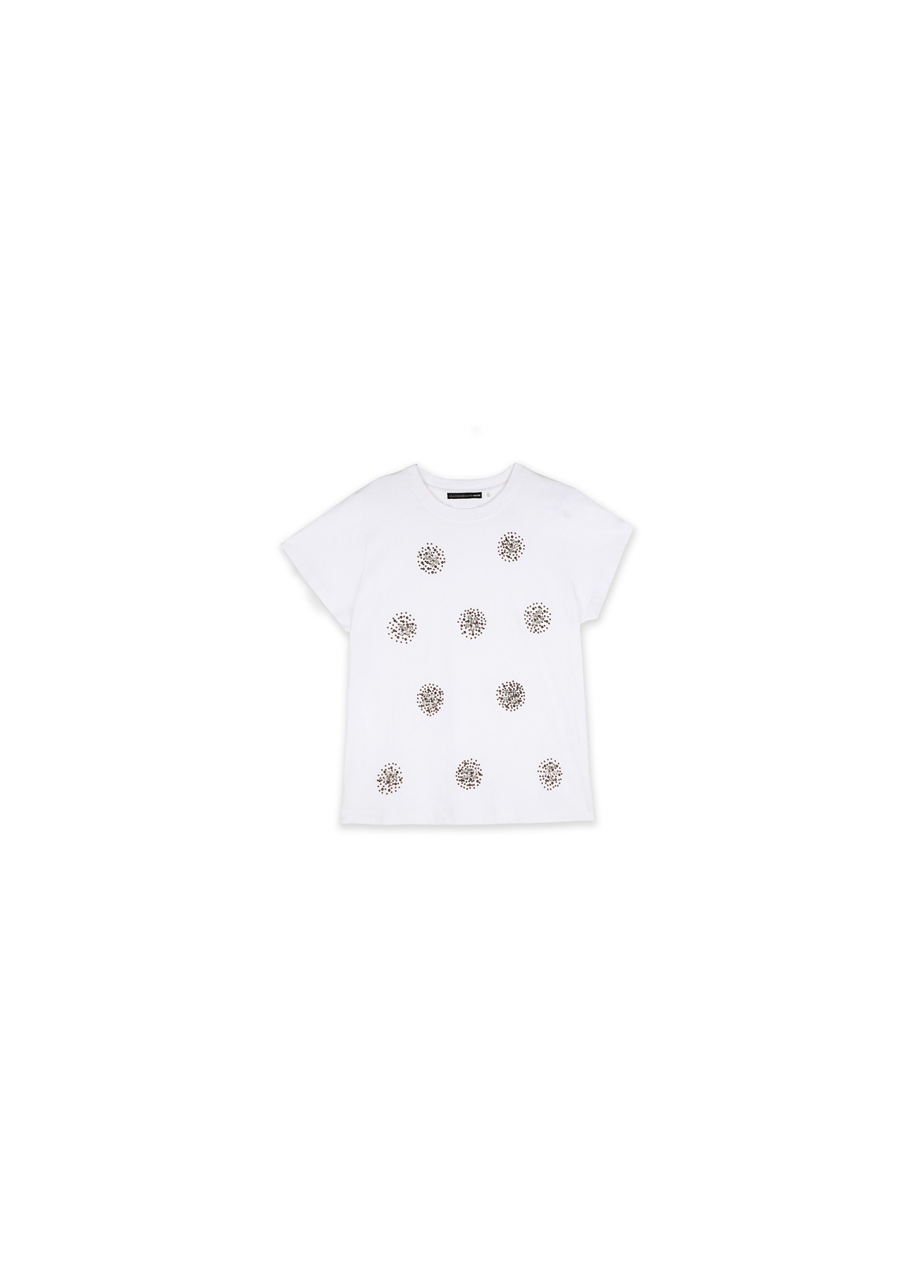 White cotton t-shirt adorned with sparkling flower jewels. Features a round neckline and short sleeves, adding a sophisticated touch. Perfect to pair with basics or elevate casual looks.