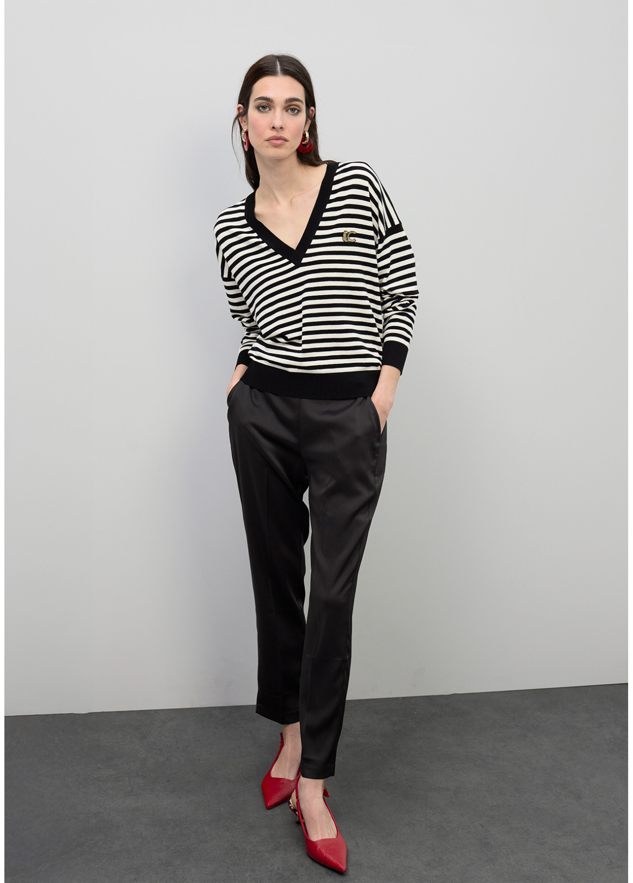 Fine knit sweater with V-neck and bicolor stripe design. Embroidered logo detail on the chest. Perfect for a casual yet elegant look, ideal for cooler days. Comfortable and versatile, easily pairs with pants or skirts.